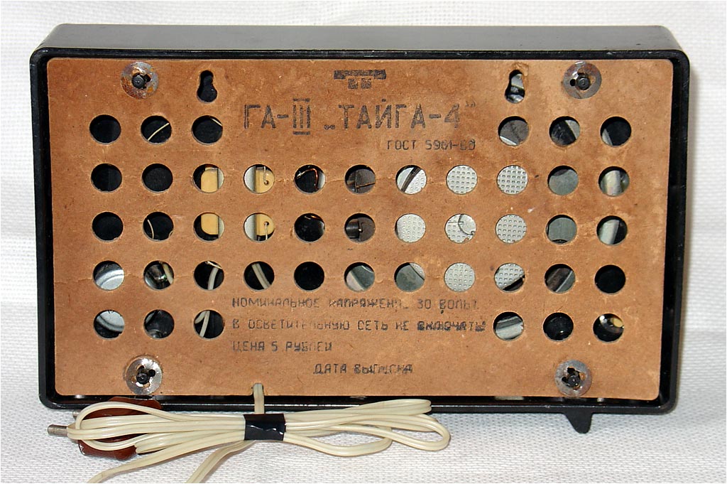 Абонентский громкоговоритель "Тайга-4" с 1972 года выпускал Пермский телефонный завод. Напряжение в линии 30 вольт. Подводимая мощность 150 мВт. Габариты громкоговорителя 200х166х70 мм. Вес 1 кг.