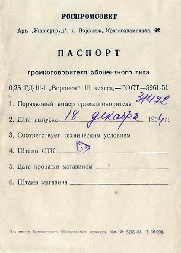 громкоговоритель "Воронеж" с 1954 года выпускала Воронежская артель "Универтруд".