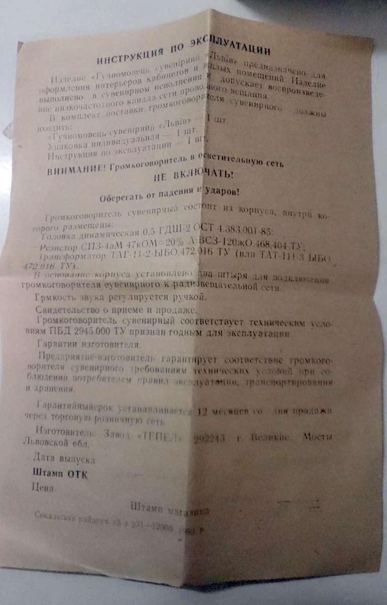 Абонентский громкоговоритель "Львiв" выпускался с 1989 года заводом "Тепел". 30 В. сувенирный громкоговоритель, но в отличие от стандартных АГ имеет не очень высокие электроакустические параметры.