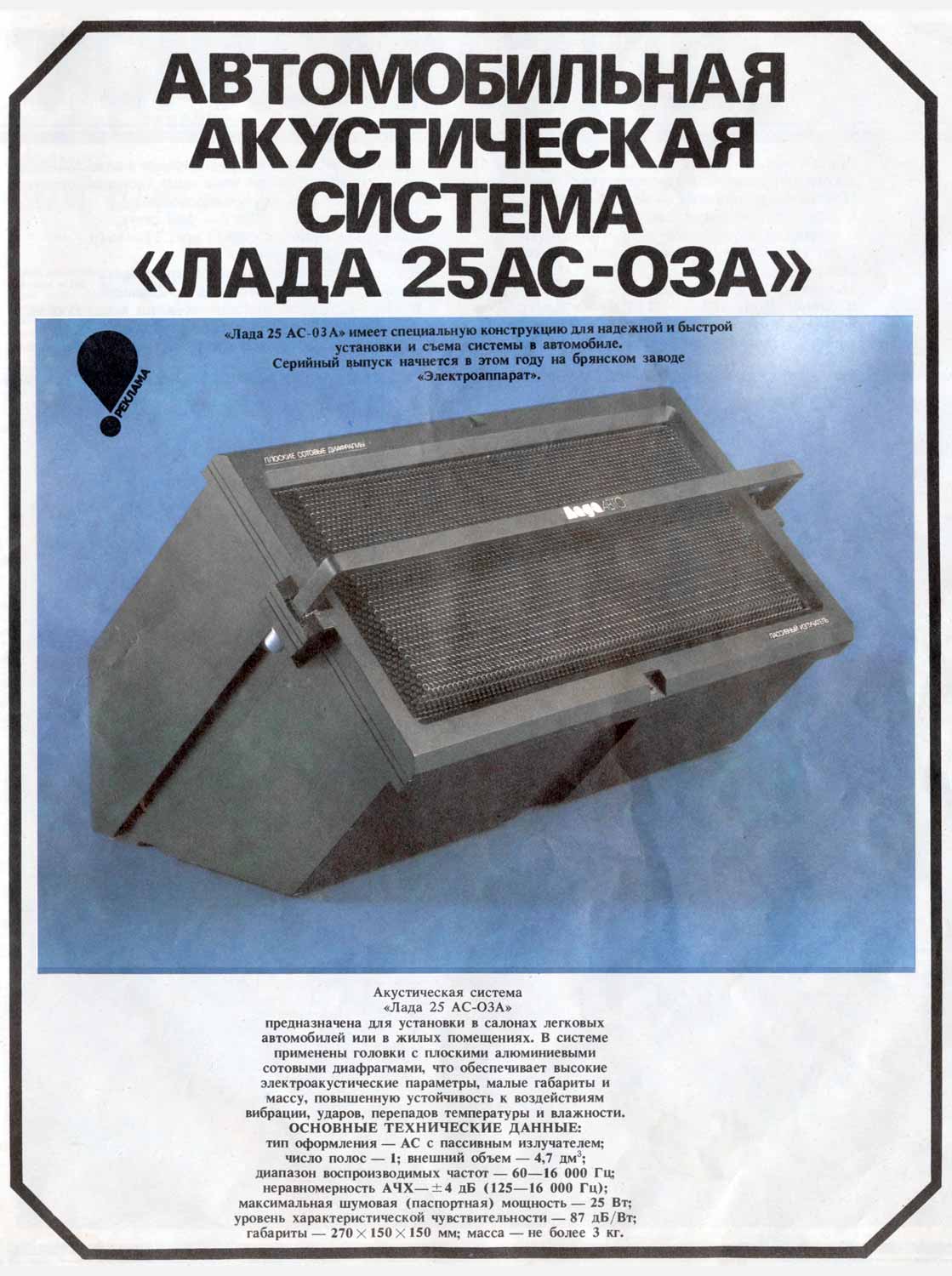 Однополосная АС предназначена для установки в салонах легковых автомобилей