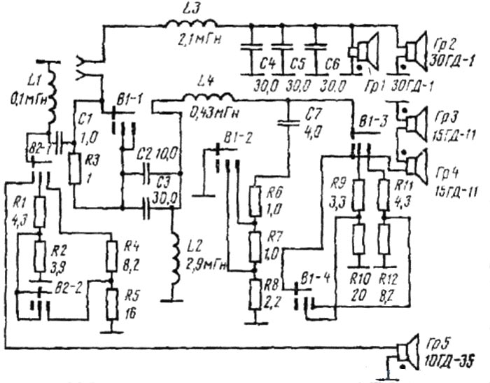 динамики: НЧ (2 шт.): 30 ГД-1 (75 ГДН-1-4), СЧ (2): 15 ГД-11 (20 ГДС-4-8)