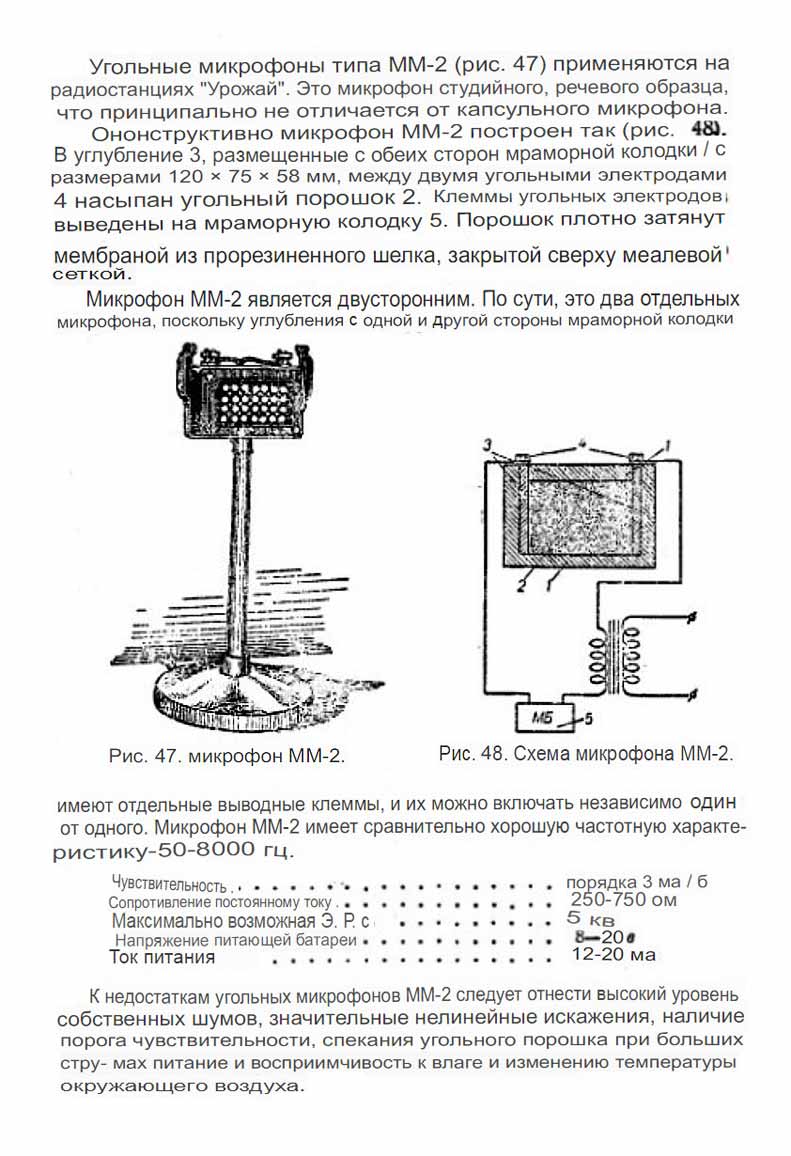 Угольный (мраморный) микрофон "ММ-2" выпускался предположительно с 1940 года. Микрофон в основном речевой, раздельный в двух направлениях. Описание слева.