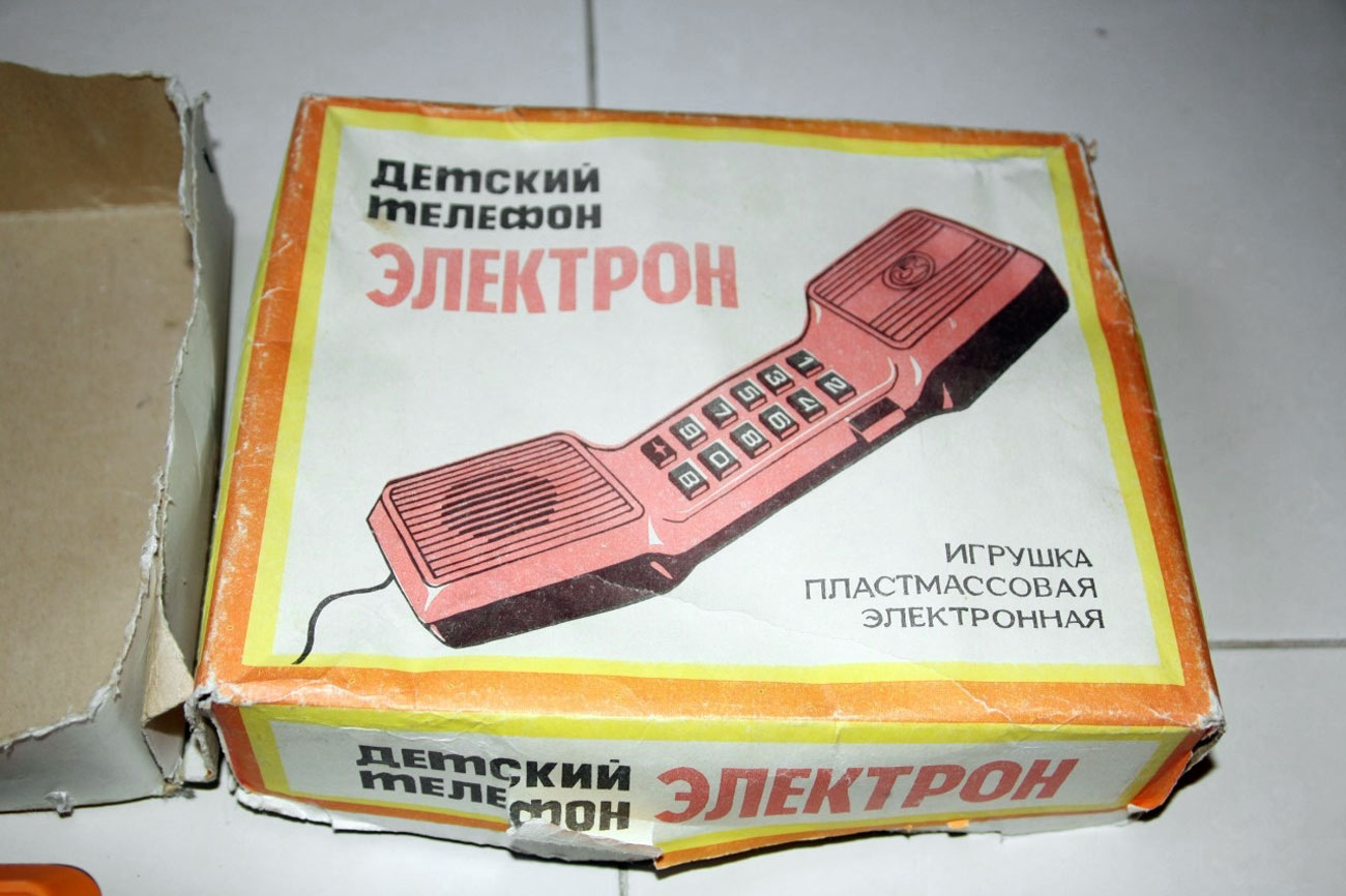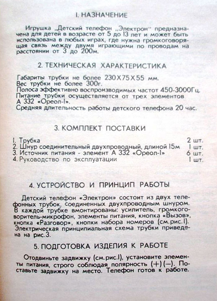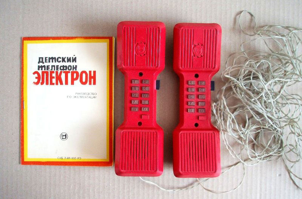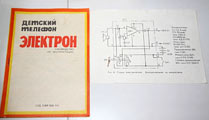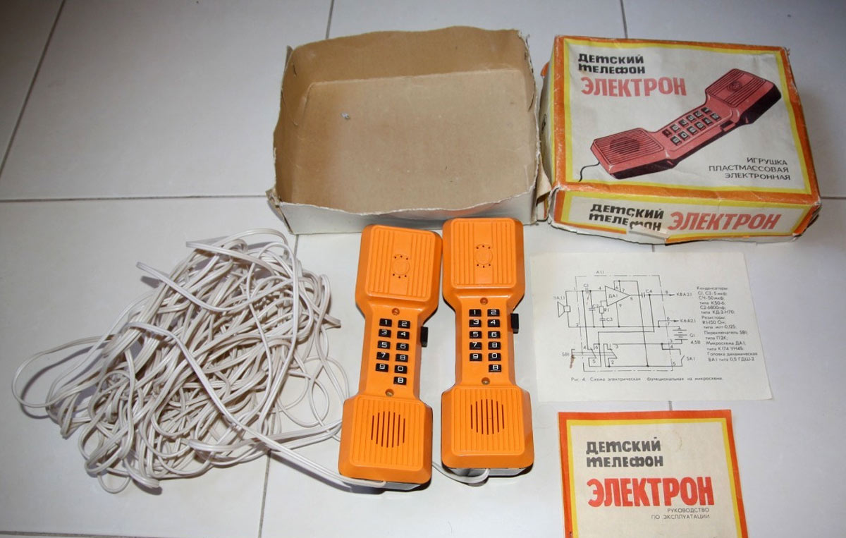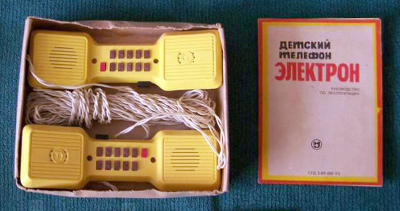 Детский телефон "Электрон" выпускался с 1986 года Уральским заводом "Омега". Телефон предназначен для проводной связи до 200 метров.