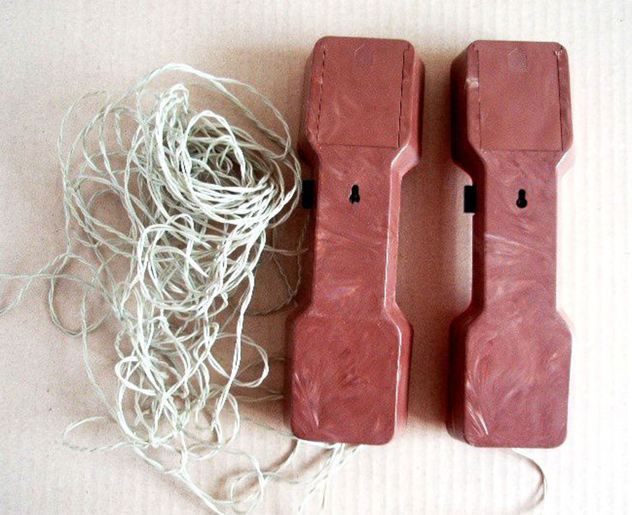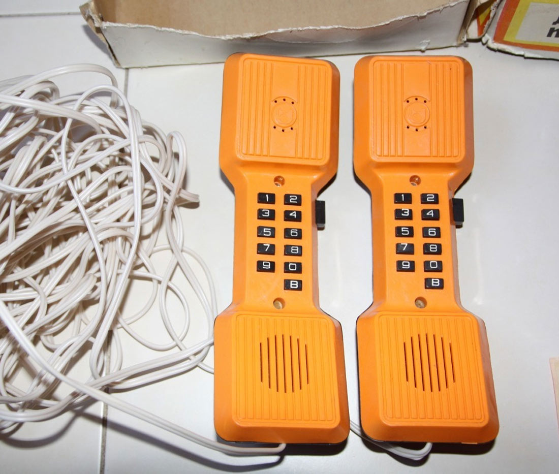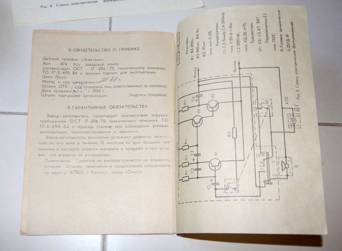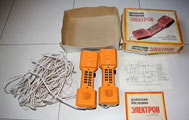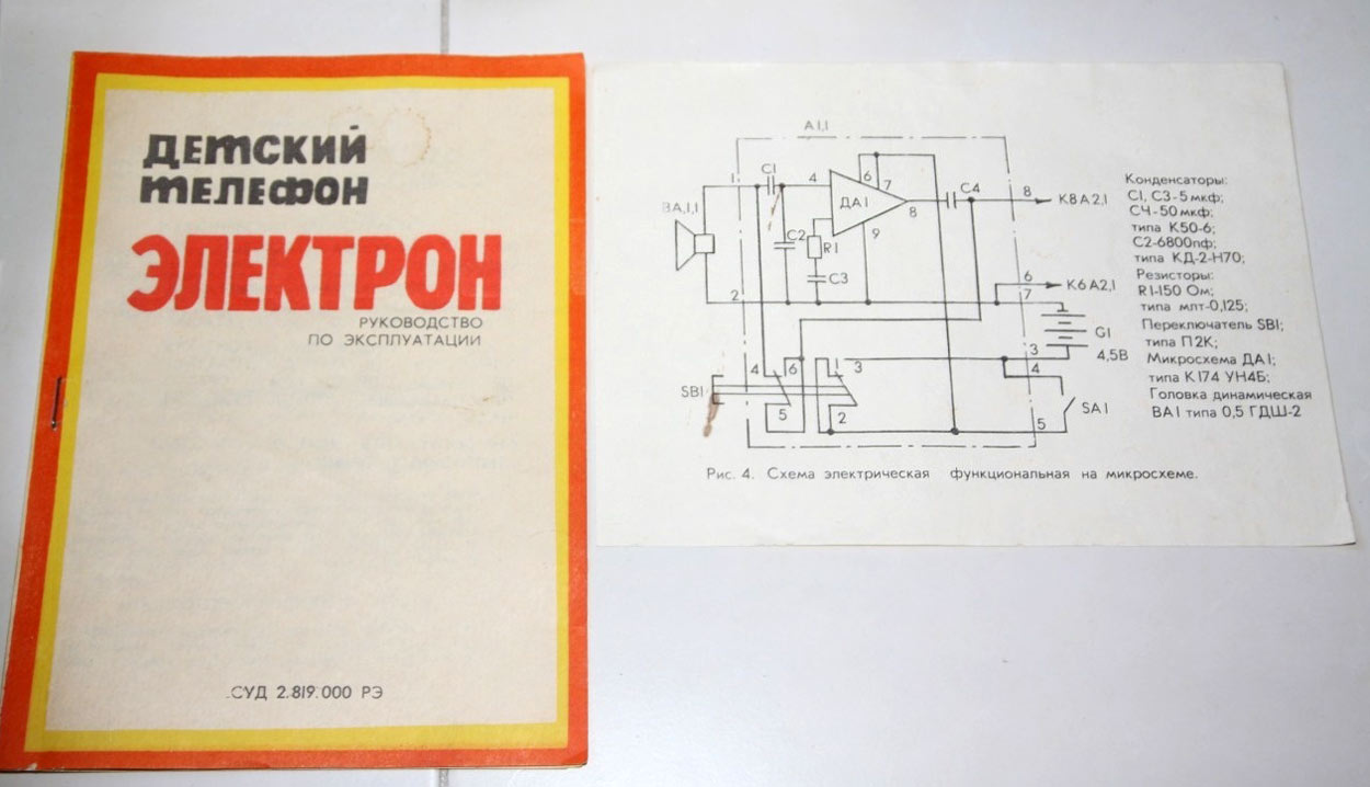 Детский телефон "Электрон" выпускался с 1986 года Уральским заводом "Омега". Телефон предназначен для проводной связи до 200 метров.