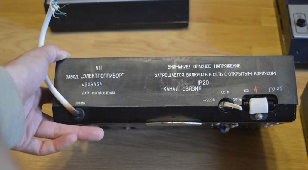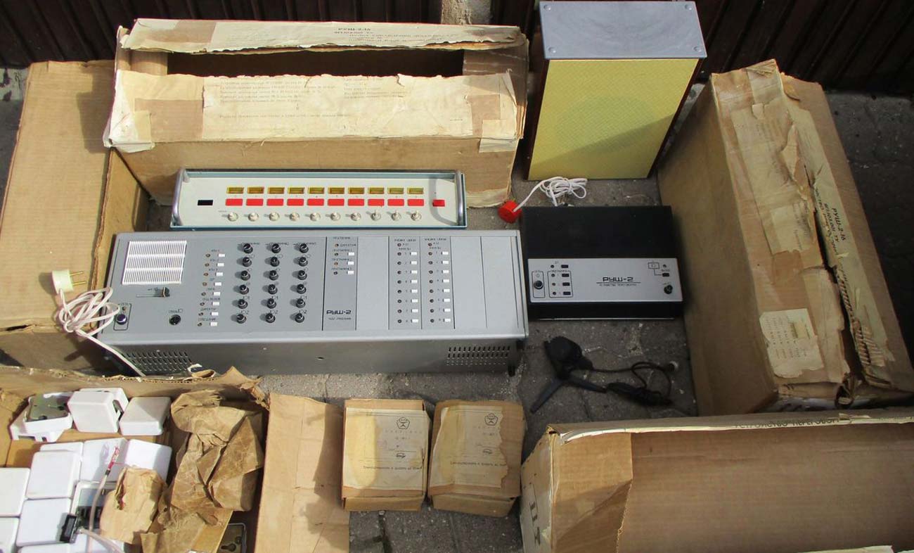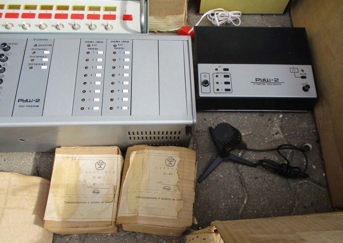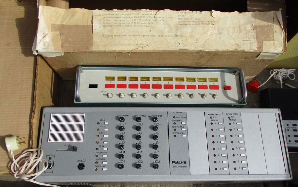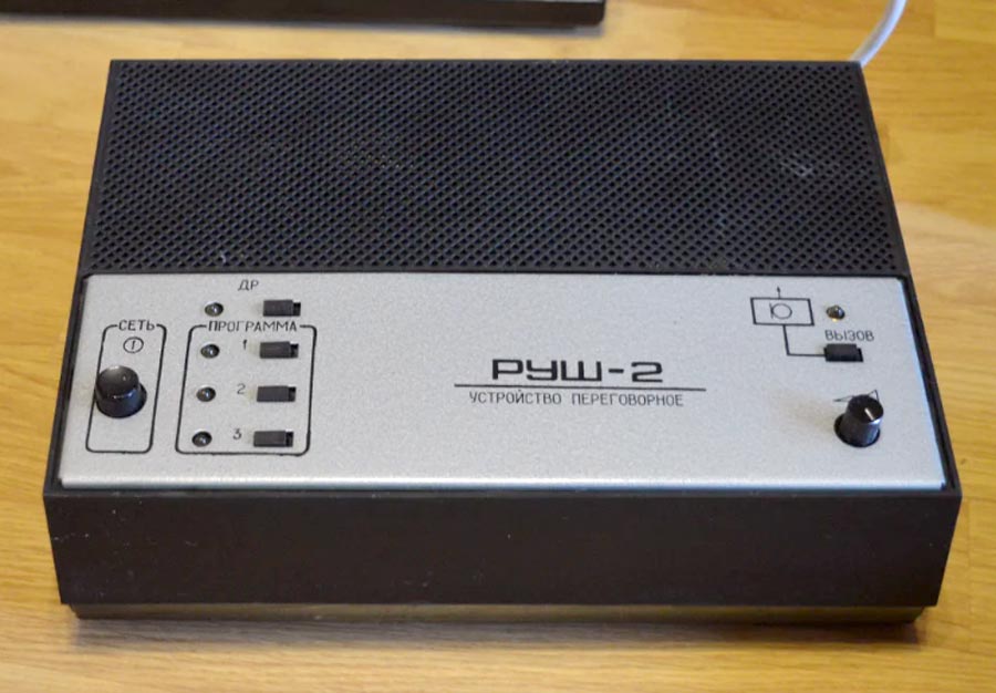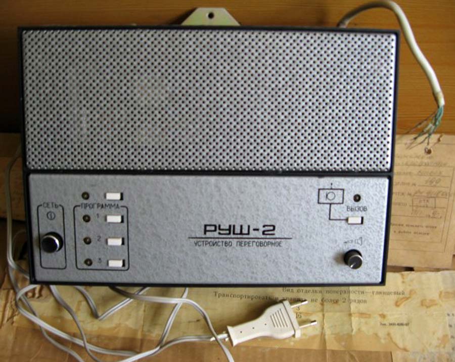 Переговорное устройство "РУШ-2" предположительно с 1985 года выпускал Московский завод "Электроприбор". Устройство служит для оборудования кабинетных лингафонных систем в учебных учреждениях.