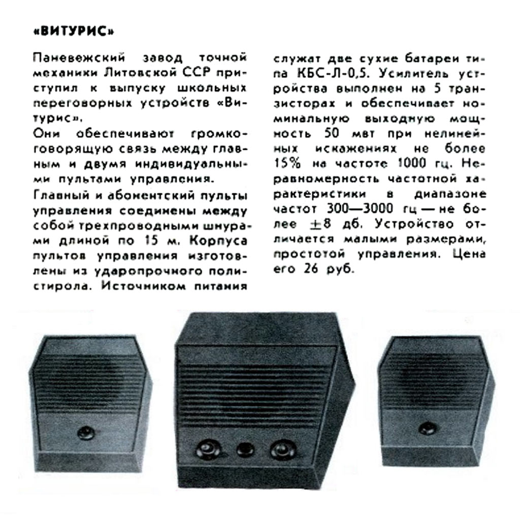 Школьное переговорное устройство "Витурис" выпускалось с 1969 года Паневежским заводом точной механики. Информация в журнале "Новые товары" № 7 за 1972 год.