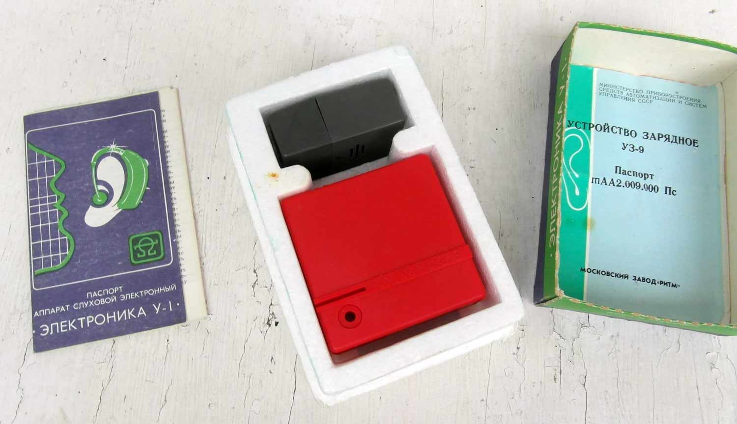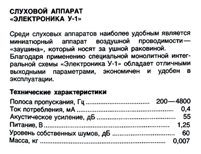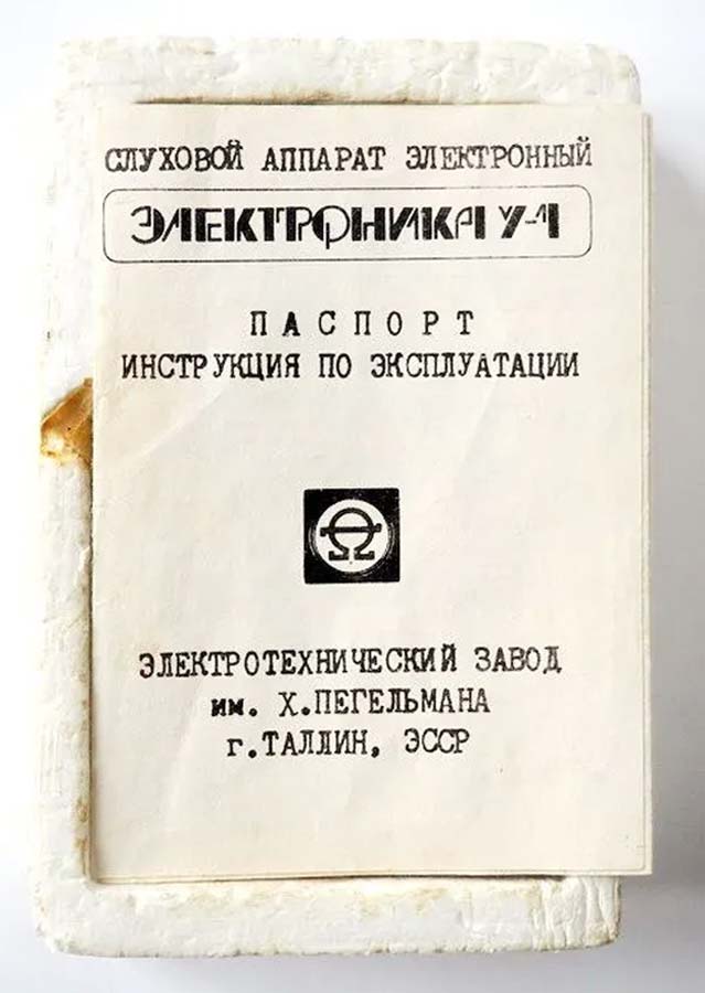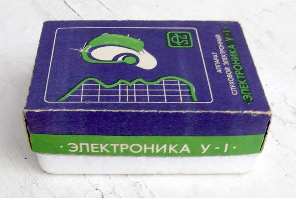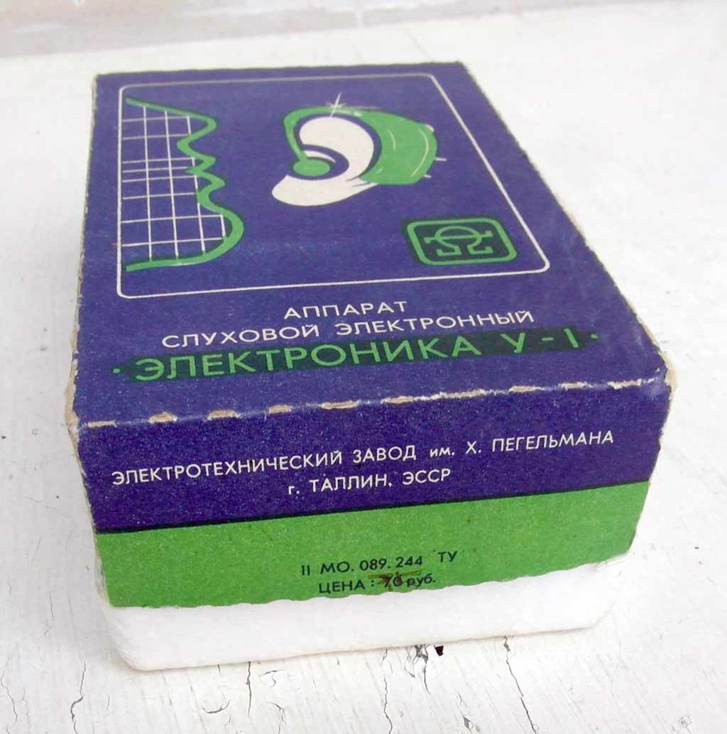 Слуховой электронный аппарат воздушной проводимости "Электроника У-1" выпускался возможно с 1987 года Московским заводом "Ритм" и электротехническим заводом им. Х.Пегельмана, город Таллин, ЭССР.