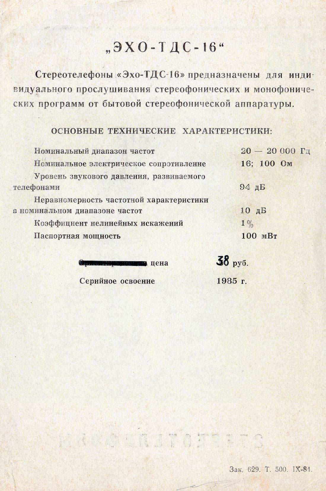 стереофонические головные телефоны "ЭХО ТДС-16" (тип Н16-40C) выпускались