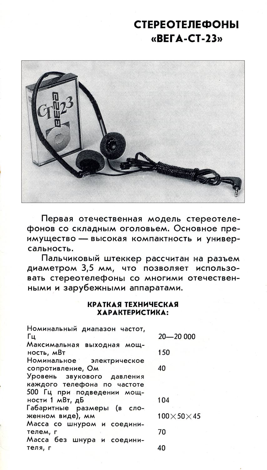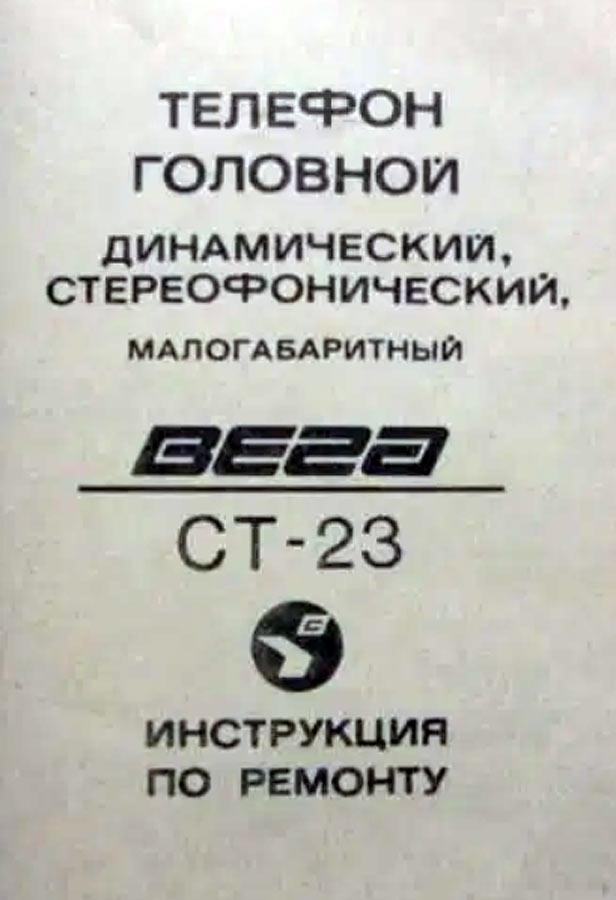 Телефоны головные динамические стереофонические малогабаритные "Вега СТ-23" выпускались с 1989 года Бердским ПО "Вега". Описание см. ниже.