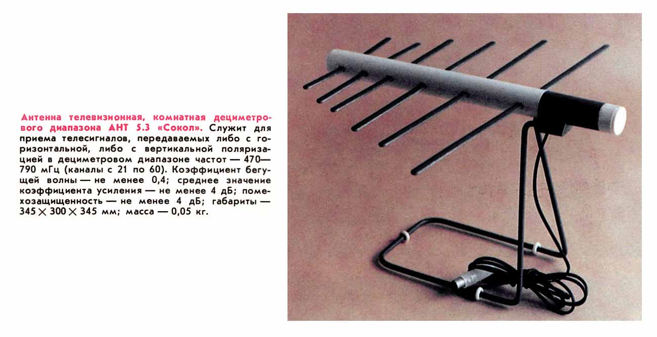 Антенна телевизионная комнатная "АТН-5.3" (Сокол) выпускалась с 1985 года. Предназначена для приёма частот 470...790 МГц с вертикальной или горизонтальной поляризацией. Пассивная.