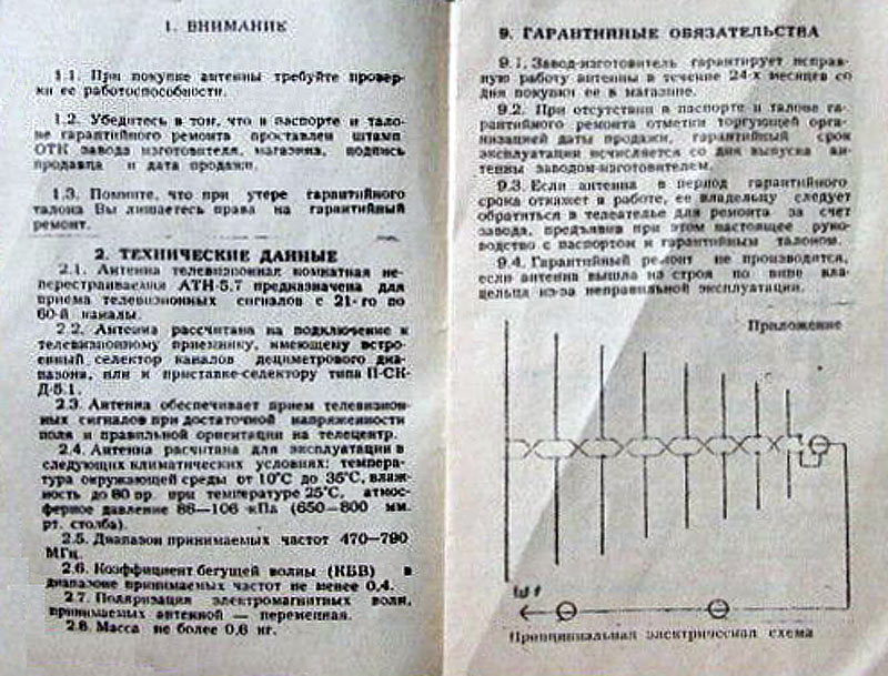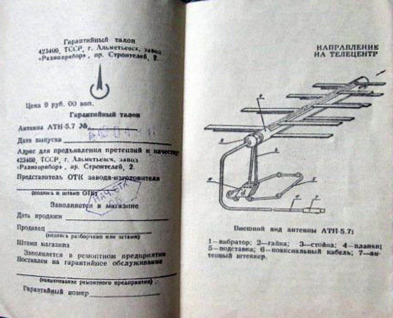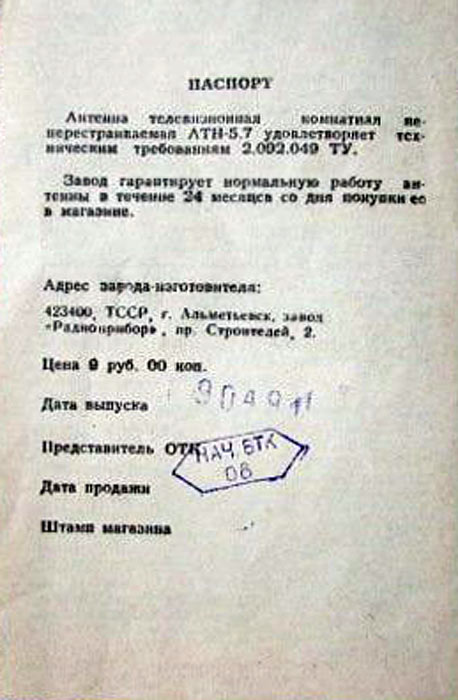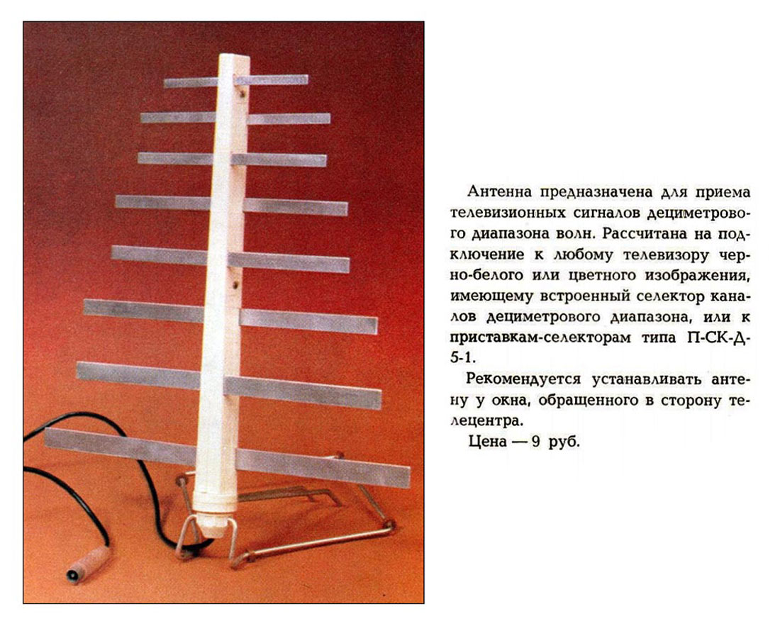 Антенну телевизионную комнатную неперестраиваемую для диапазона ДМВ - "АТН-5.7" выпускал с 1984 года Альметьевский завод "Радиоприбор".