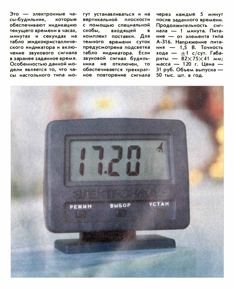 Настольные электронные часы - будильник "Электрониа-8 4/3" выпускались с 1990 года. Рекламное описание настольных электронных часов "Электрониа-8 4/3" в журнале "Новые товары" №11 за 1990 год.