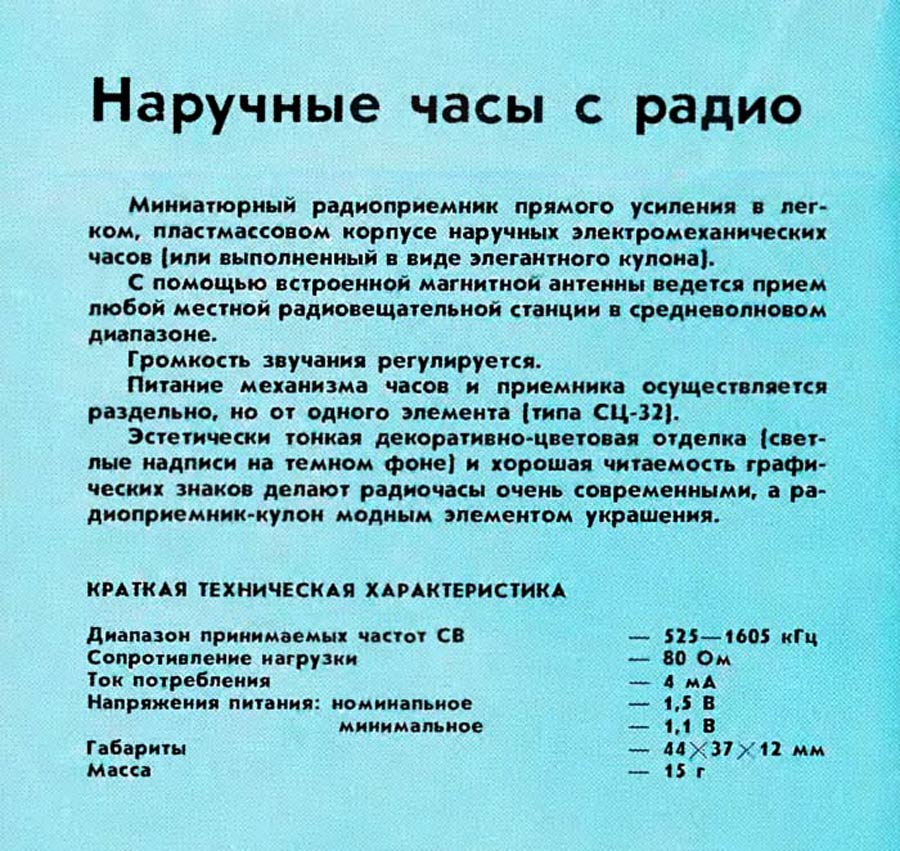 питания: номинальное 1,5 В, минимальное 1,1 В. Габариты радиочасов - 44