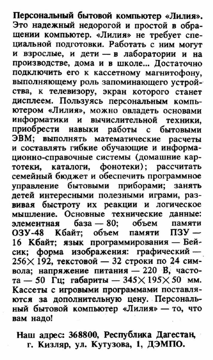 Персональный бытовой компьютер "Лилия" выпускался возможно с 1992 года Дагестанским Электро-Механическим Производственным Объединением.