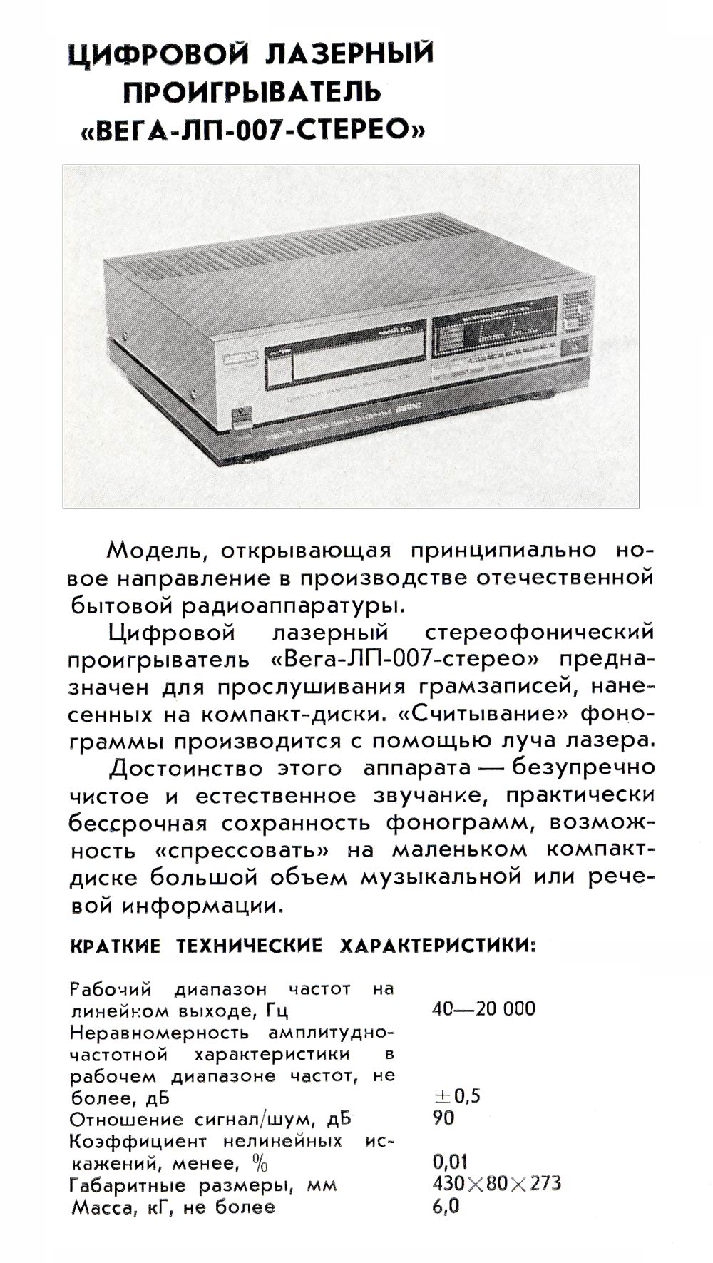 (~ 100 штук) выпустило Бердское ПО "Вега". Цифровой лазерный стереофонический