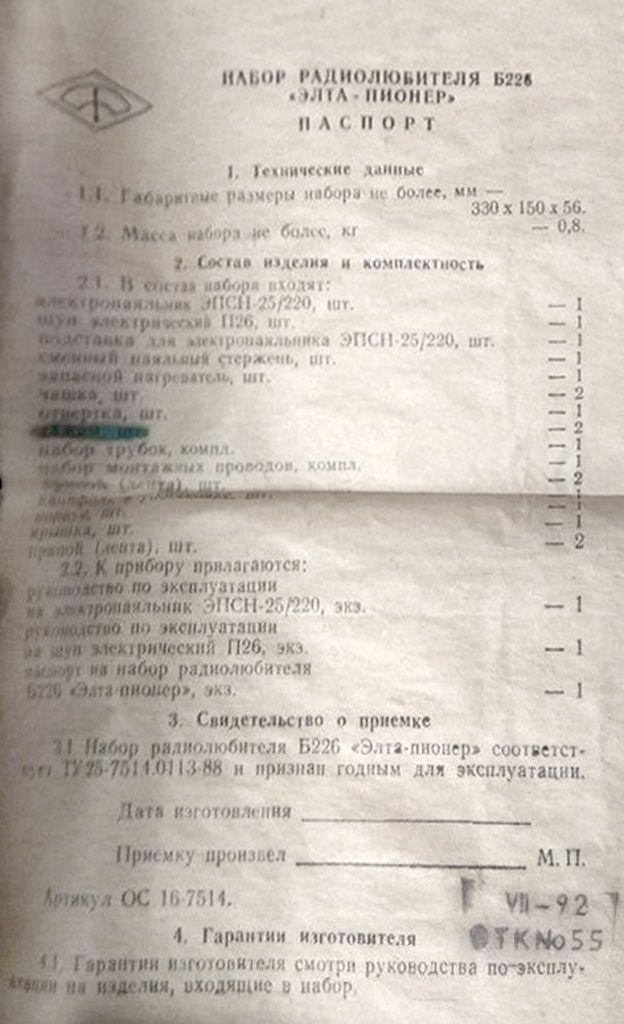 Набор радиолюбителя "Элта-Пионер" (Б-226) выпускался с 1986 года Омским ПО "Электроточприбор", город не установлен. Информация визуальная.