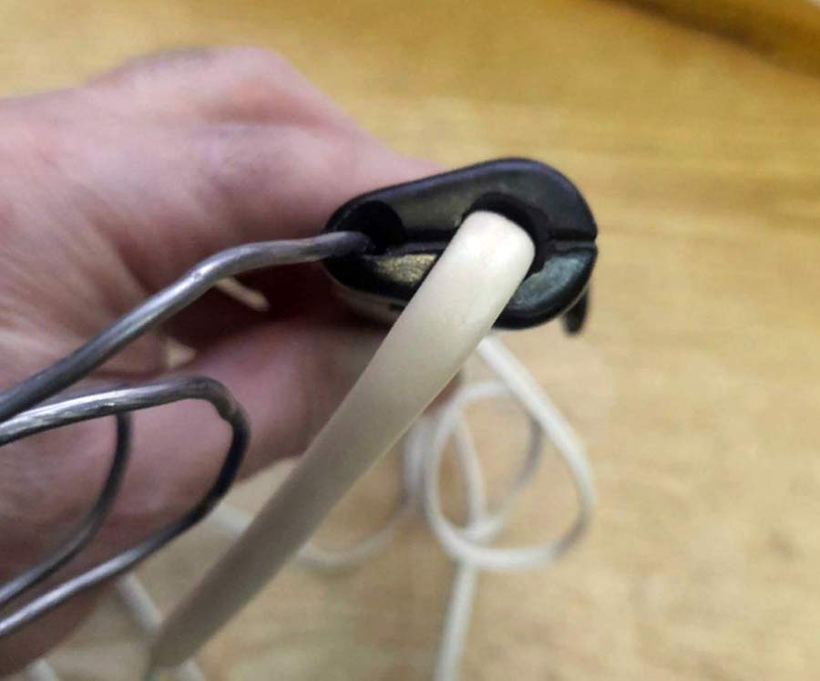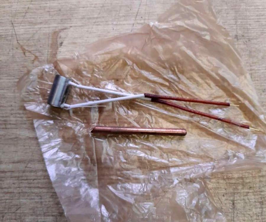 При нажатии на рычаг, прут олова с канифолью подаётся на жало электропаяльника.