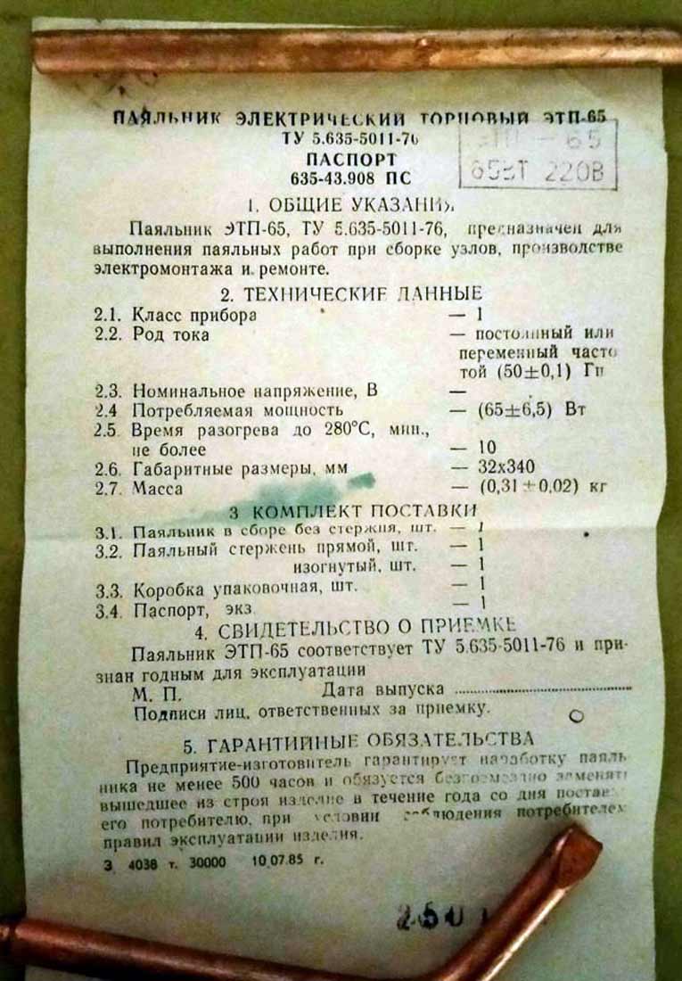 Паяльник электрический торцовый "ЭТП-65" выпускался возможно с 1985 года Горьковским предприятием "ЭРА". Описание паяльника в 1-м файле.