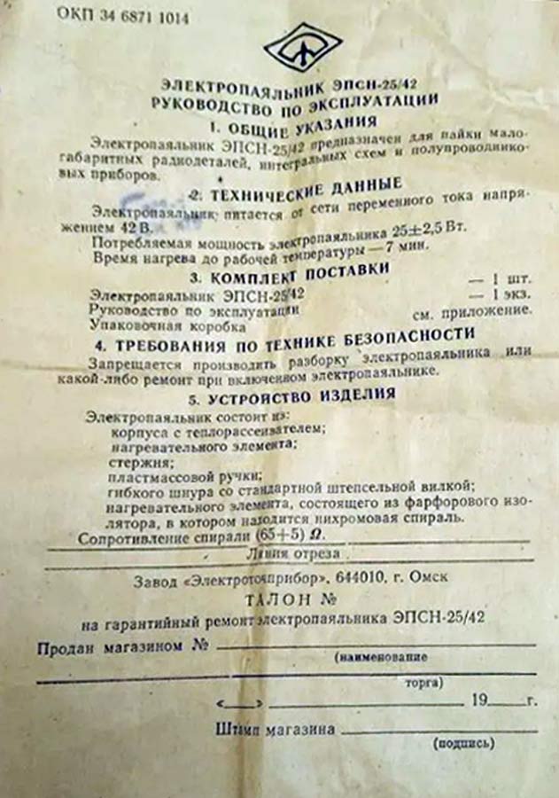 В комплекте: электропаяльник «ЭПСН-25/42», изготовленный в соответствии