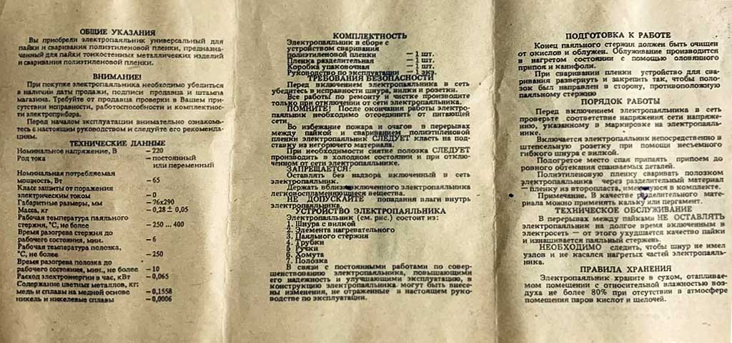 Мощность электропаяльника 65 Вт. Рабочее напряжение 220 В постоянного или