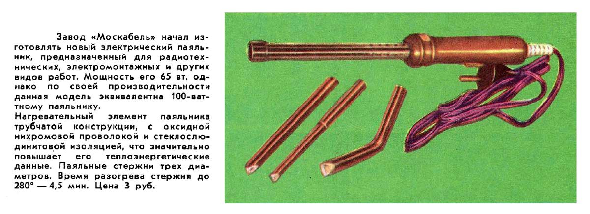 Электрический паяльник "ЭП-65/100" выпускался Московским заводом "Москабель" с 1972 года. Описание в рекламе.