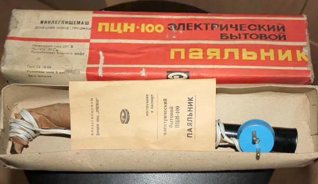 Электропаяльник бытовой "ПЦН-100/220" выпускался возможно с 1970 года Донецким заводом "Продмаш". Изготавливался по ГОСТ 7219-69. Напряжение 220 В. Мощность 100 Вт.