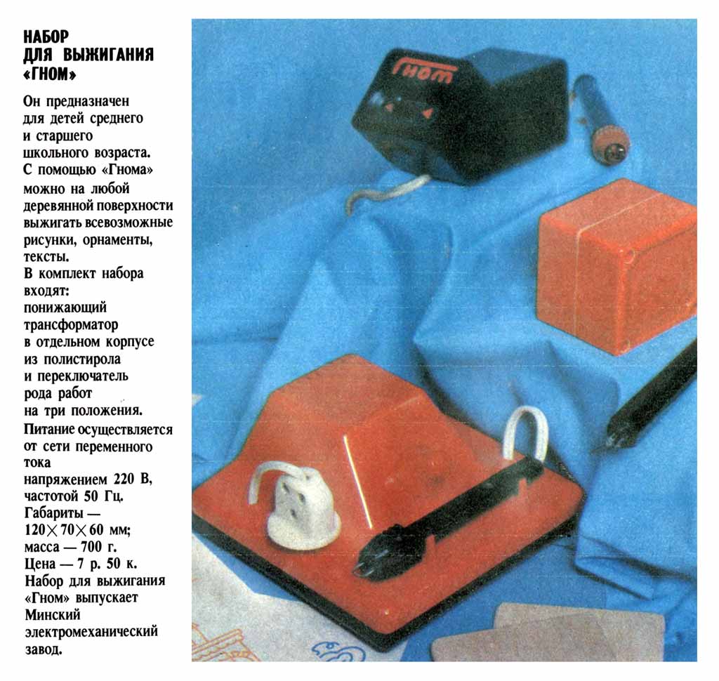 Набор для выжигания "Гном" выпускался предположительно с 1976 года "Минский электромеханический завод". Набор предназначен для выжигания переводных рисунков на гладкой деревянной поверхности.