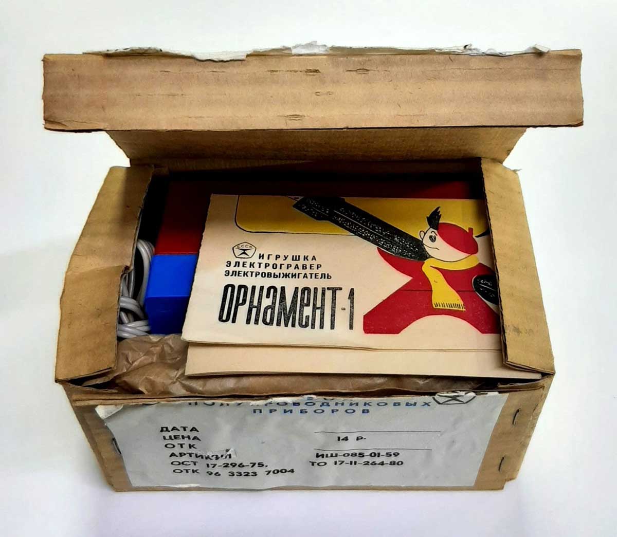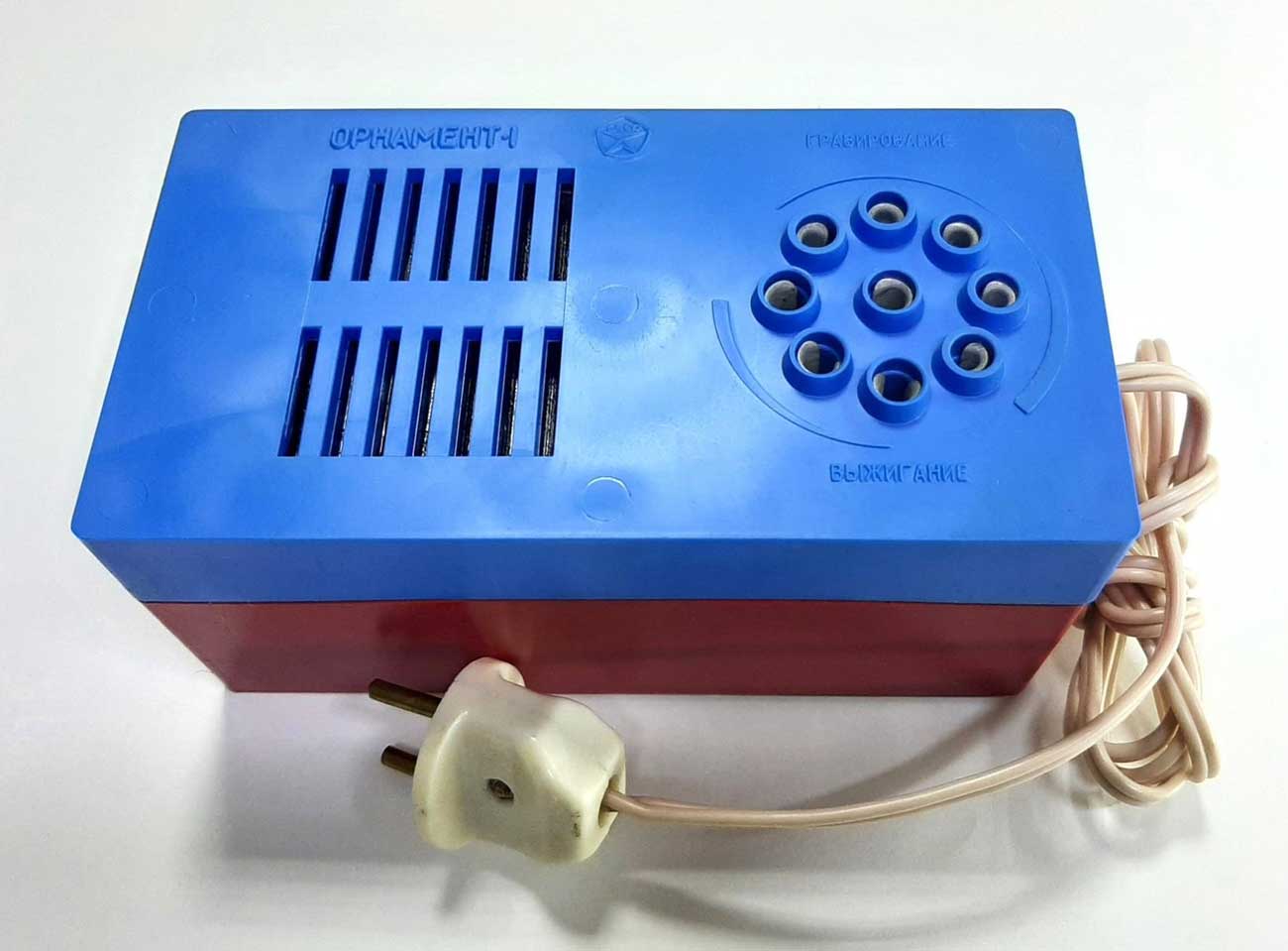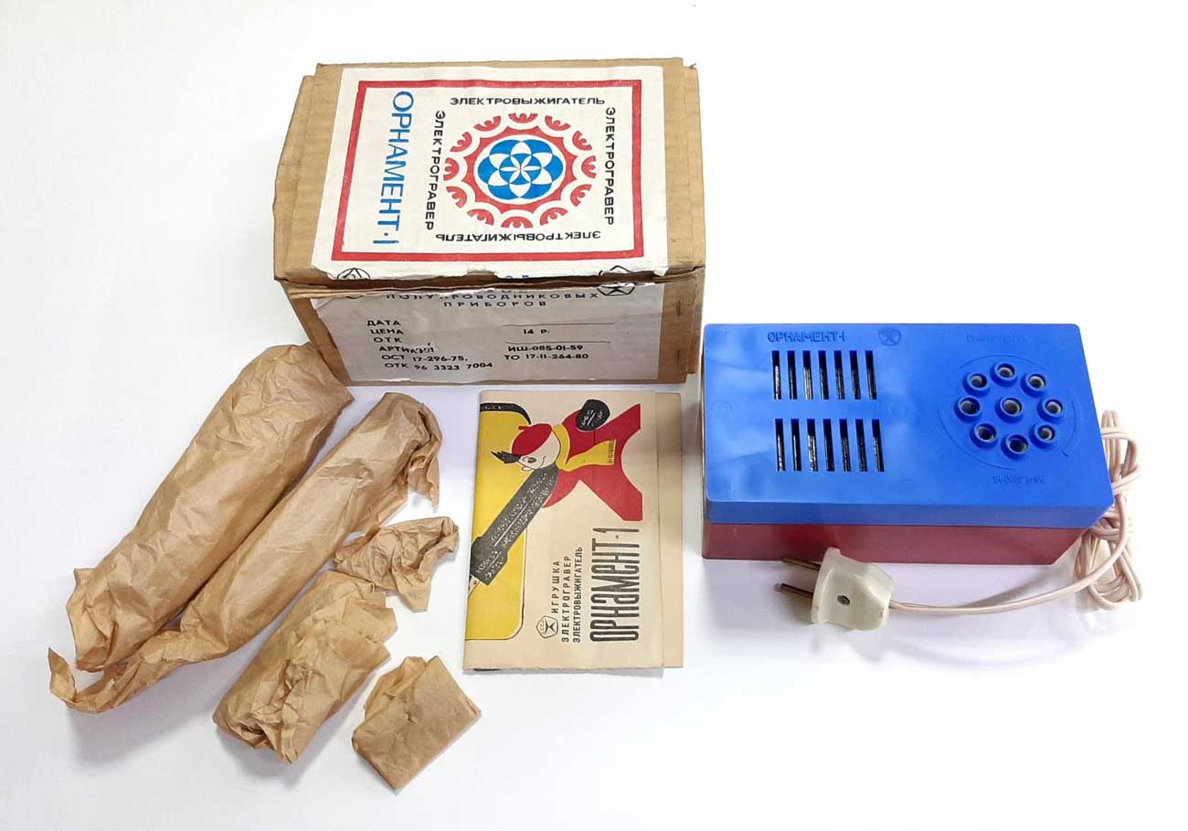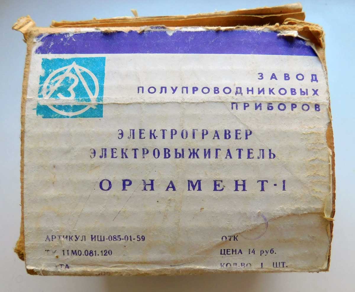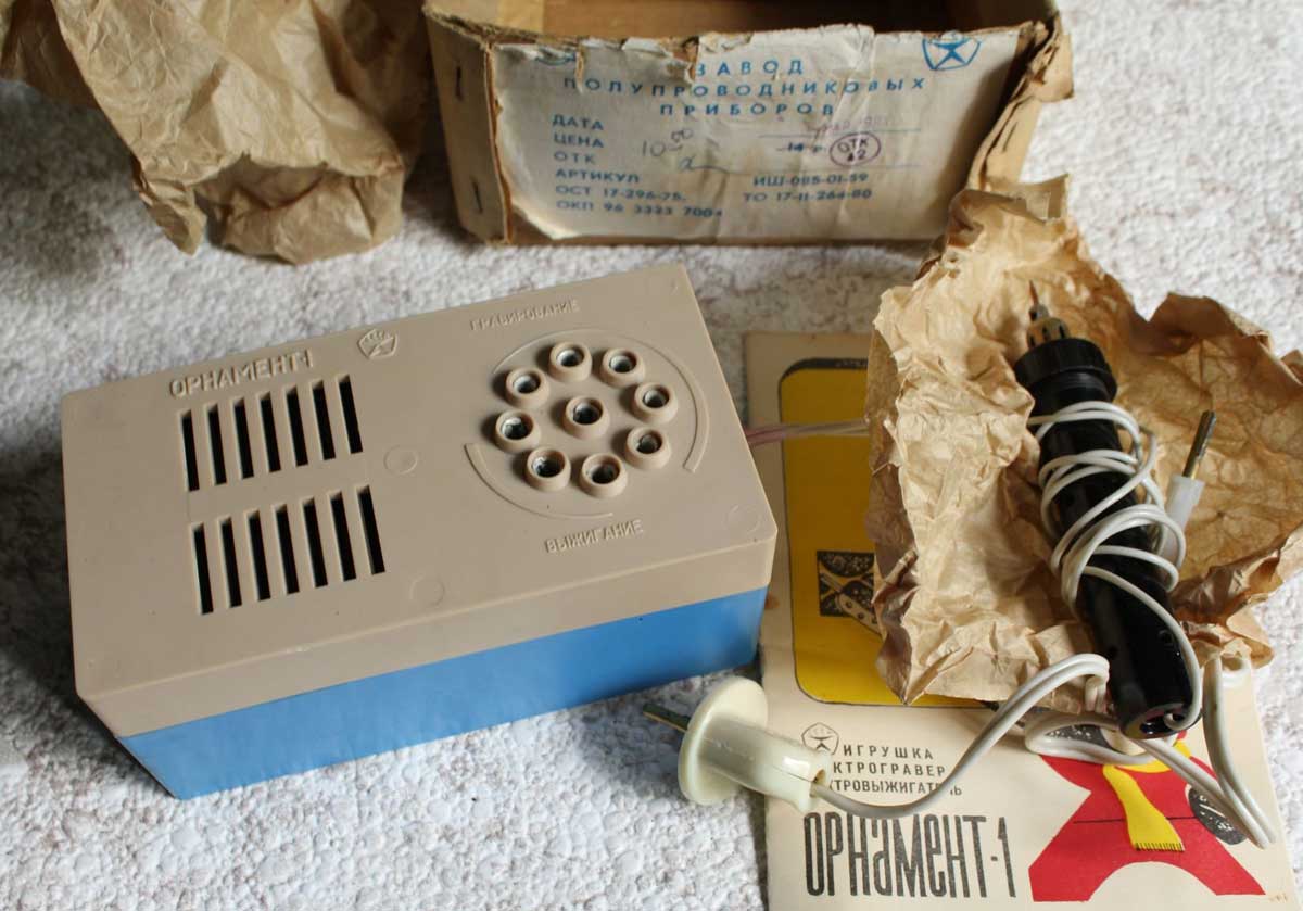 Игрушка электрогравёр и электровыжигатель "Орнамент-1" выпускался возможно с 1980 года заводом полупроводниковых приборов, гор. Йошкар-Ола. Служит для гравировки по металлу и выжигания по дереву.