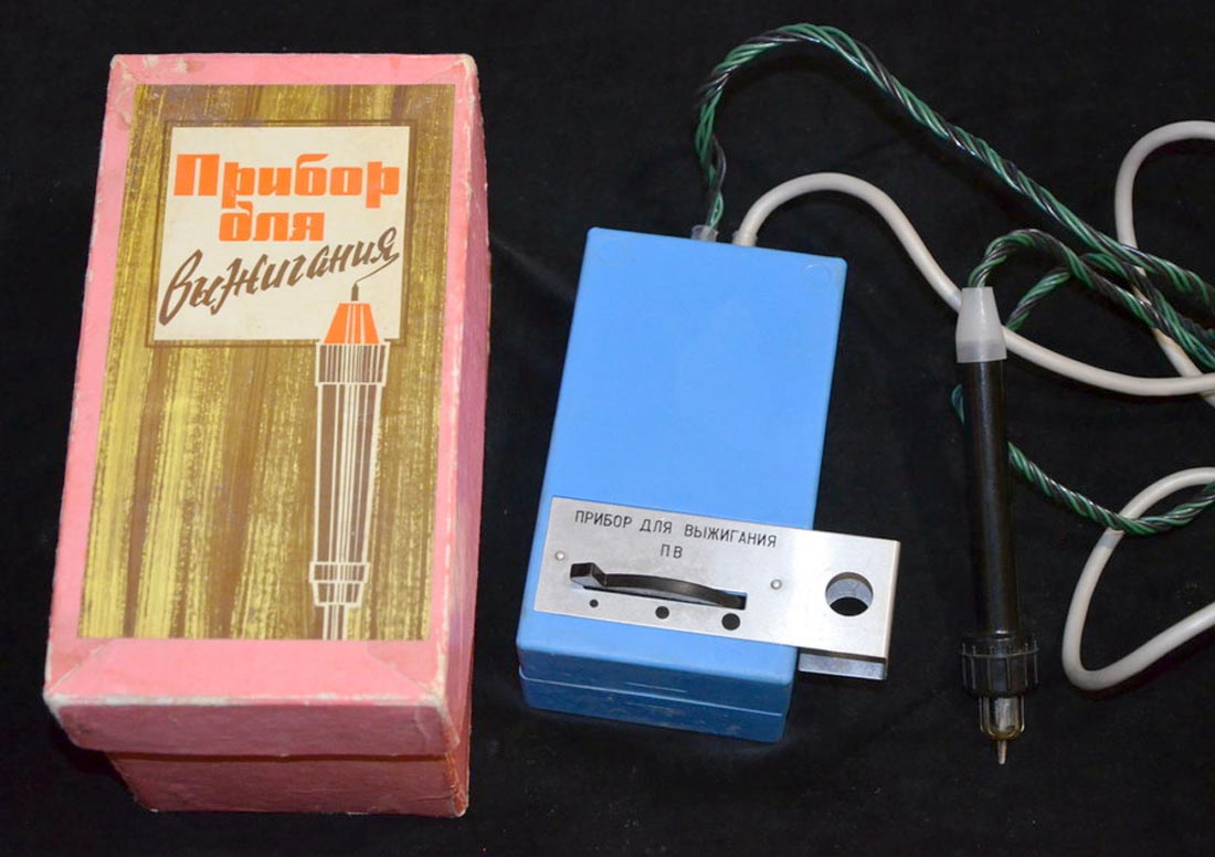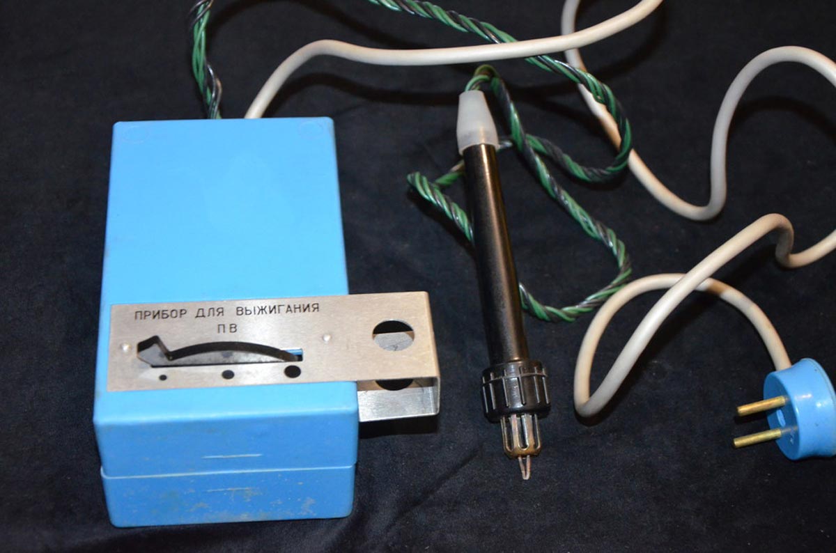 Прибор для выжигания по дереву "ПВ" выпускался предположительно с 1978 года. Питание - сеть 220 В. Потребляемая мощность 20 Вт.