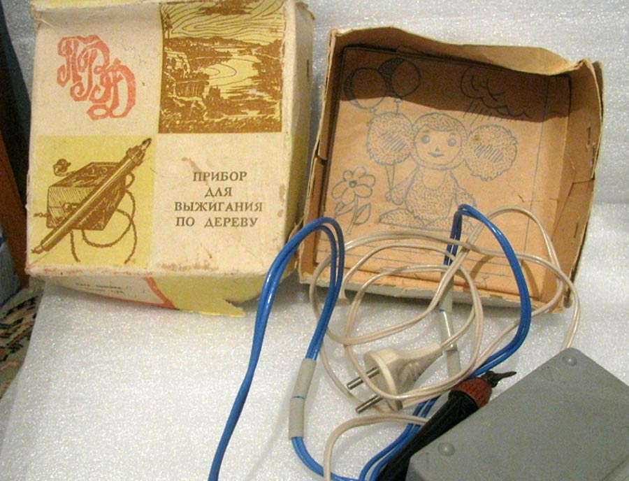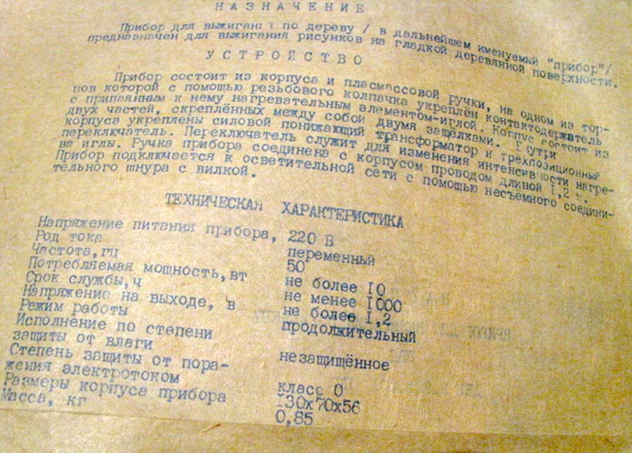 Прибор для выжигания по дереву "ПВД" выпускался возможно с 1981 года. Предназначен для выжигания рисунков на гладкой деревянной поверхности.