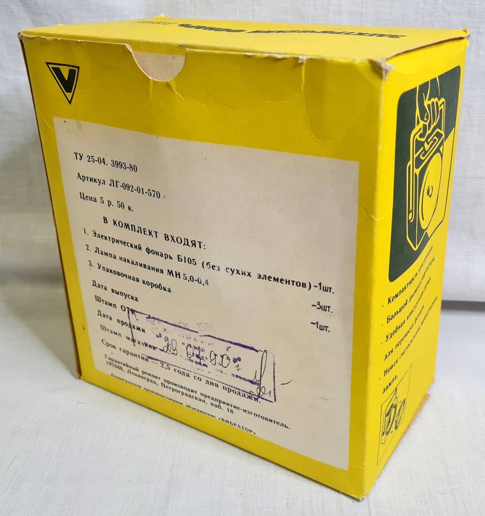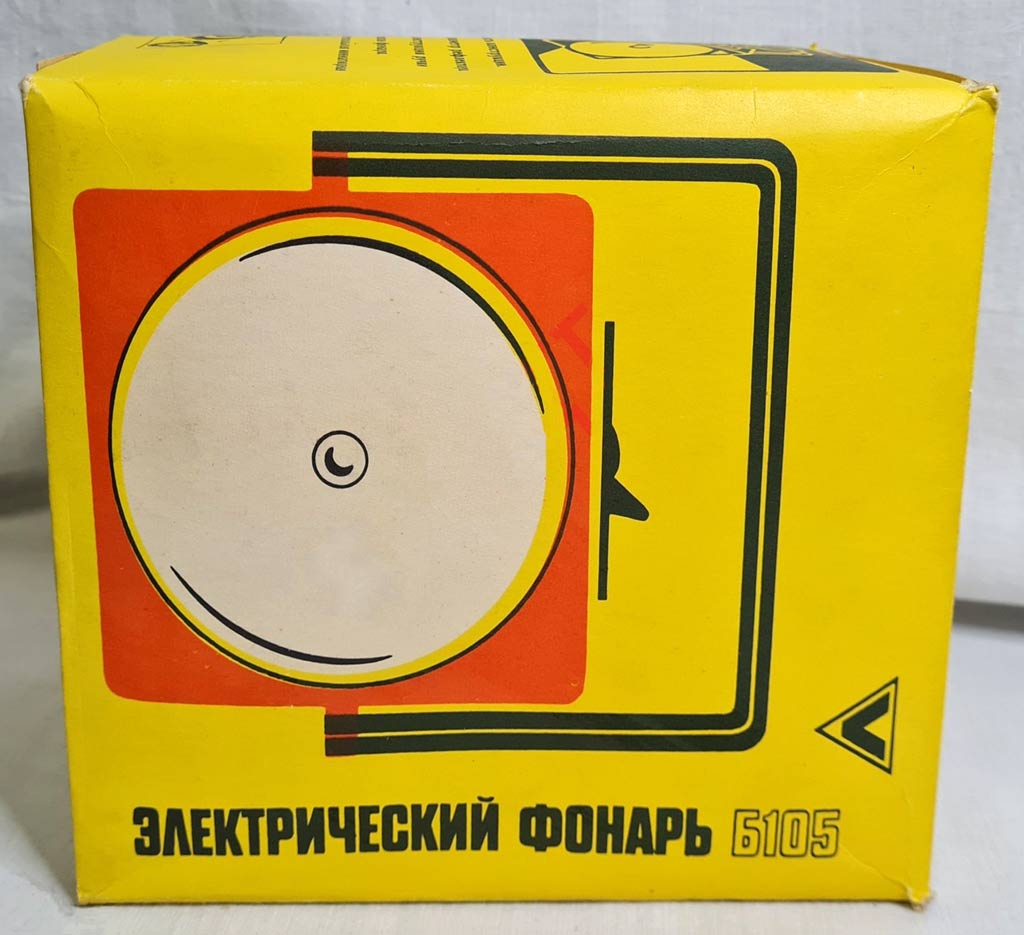 Электрический фонарь "Б-105" выпускался с 1984 года Ленинградским ПО "Вибратор". Питание от 4-х элементов типа А-343. Лампочка - МН 5,0-0,4 (5 вольт, 0,4 ампера).