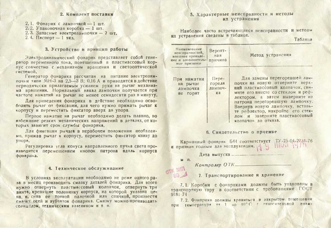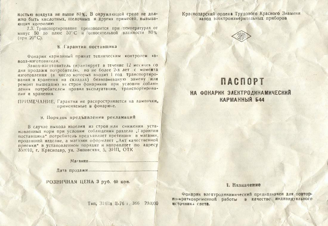Фонарик электродинамический карманный "Б-44" выпускался возможно с 1970 года Краснодарским заводом электроизмерительных приборов.