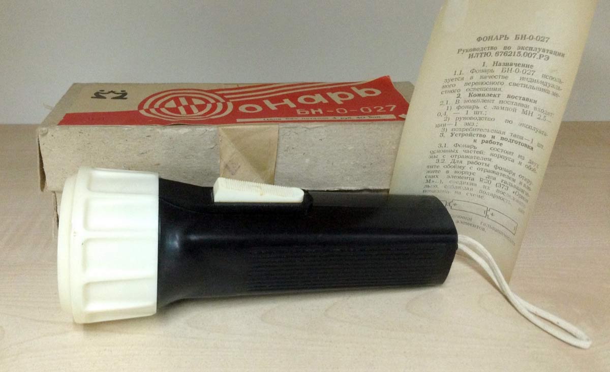 Фонарь "БН-0-027" выпускался возможно с 1990 года Ленинск-Кузнецким заводом "Кузбассэлемент". Служит в качестве индивидуального светильника. Питание - 2 элемента А-373. Лампочка - МН 2,5 В - 0,4 А.