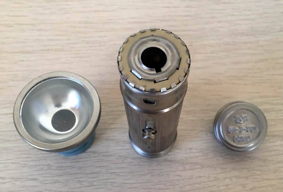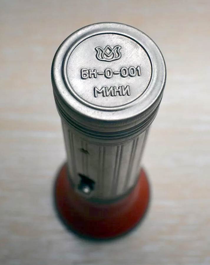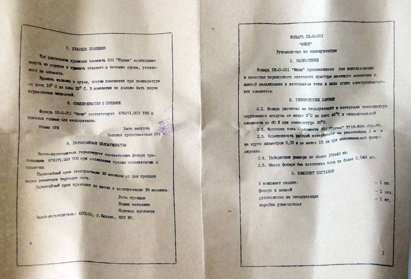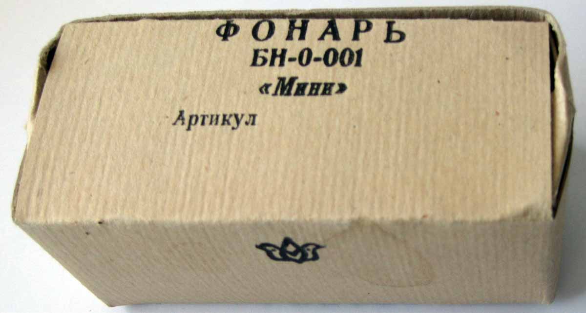 Фонарь батарейный "БН-0-001" выпускался возможно с 1978 года Казанским КПО ВС. В фонаре используется два элемента 332 "Прима". Лампа накаливания типа МН-2,5 В х 0,15 А. Габариты фонаря 108х42 мм.
