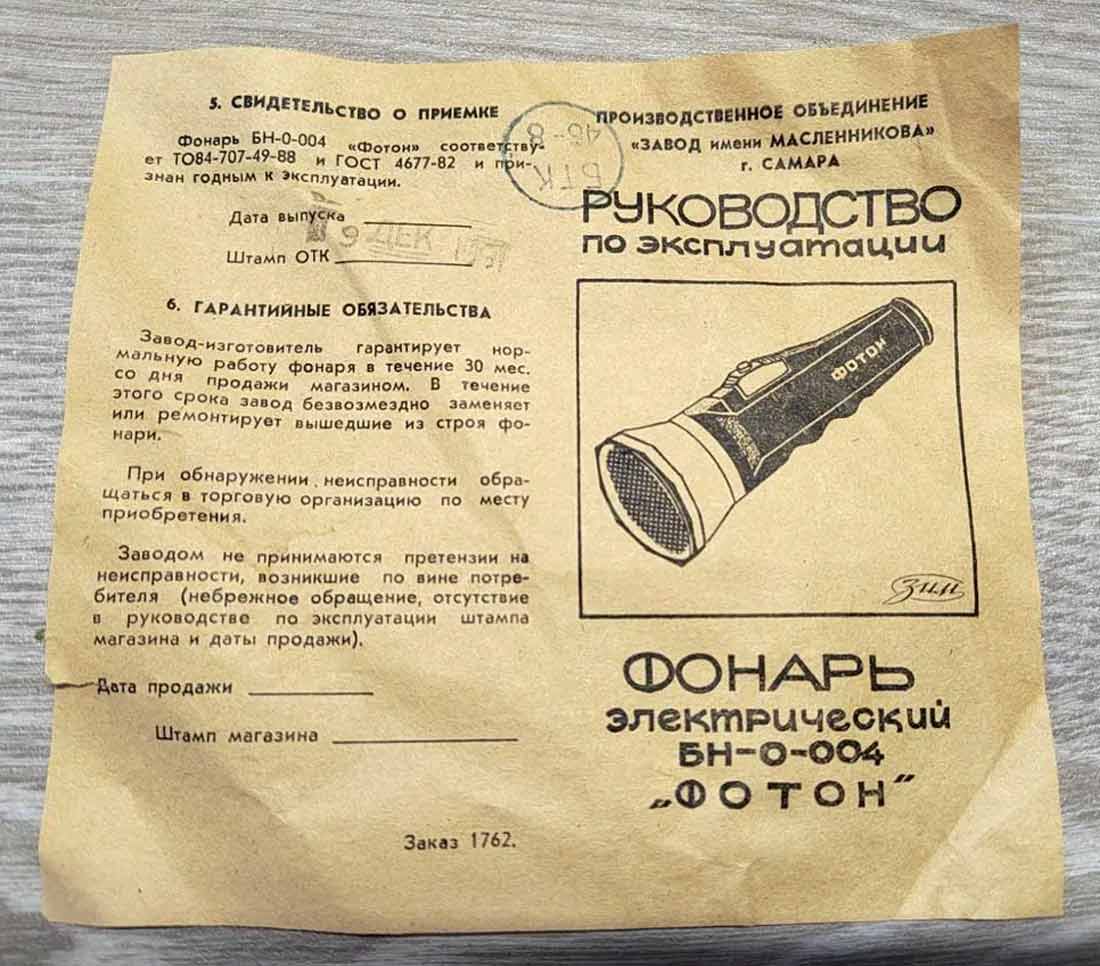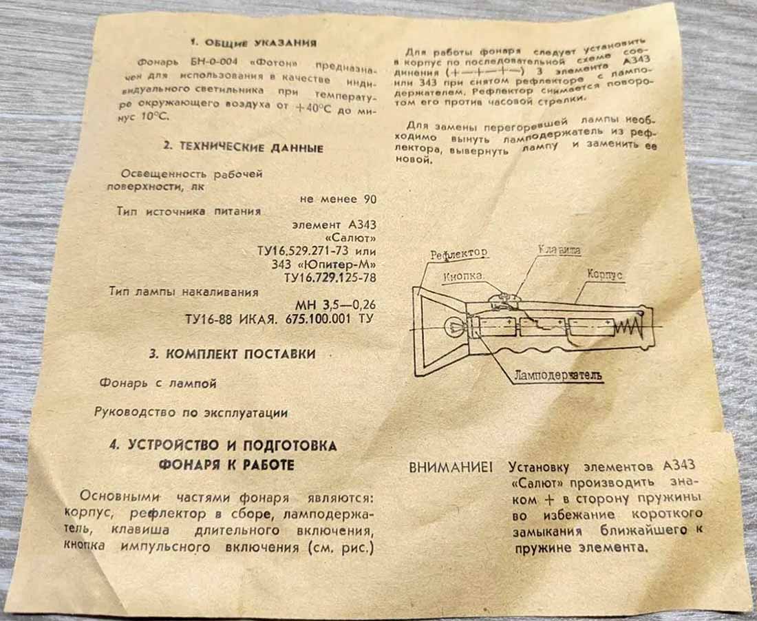 Фонарь "БН-0-004" (Фотон) выпускался возможно с 1991 года Самарским ПО "Завод имени Масленникова". Питание - три элемента А-343 типа "Салют" или "Юпитер-М". Лампа типа МН 3,5 вольта, 0,26 ампера.