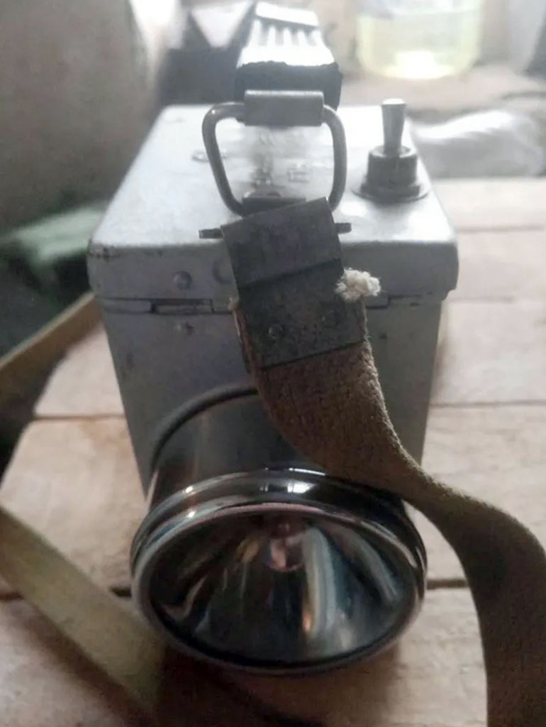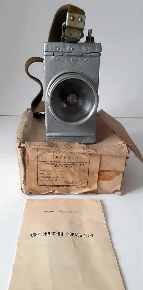 Фонарь аккумуляторный перенсной "ЭФ-3" выпускался возможно с 1964 года заводом П-я 11 города Ахтырска в Сумской области. Служит для линейных надсмотрщиков на ЖД.