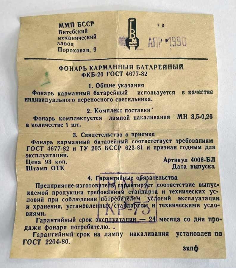 Фонарь карманный батарейный "ФКБ-20" выпускался предположительно с 1983 года Витебским механическим заводом. Информация о фонаре ниже.
