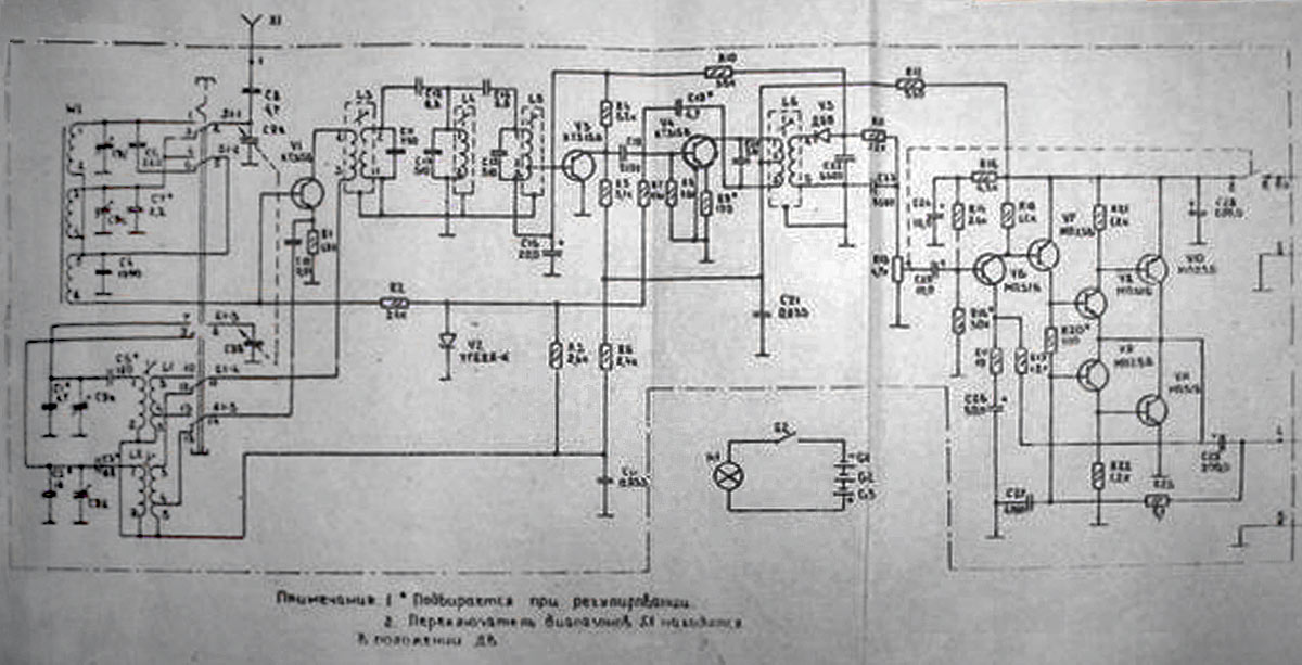 Радиоприёмник собран по супергетеродинной схеме на 9-ти кремниевых и германиевых