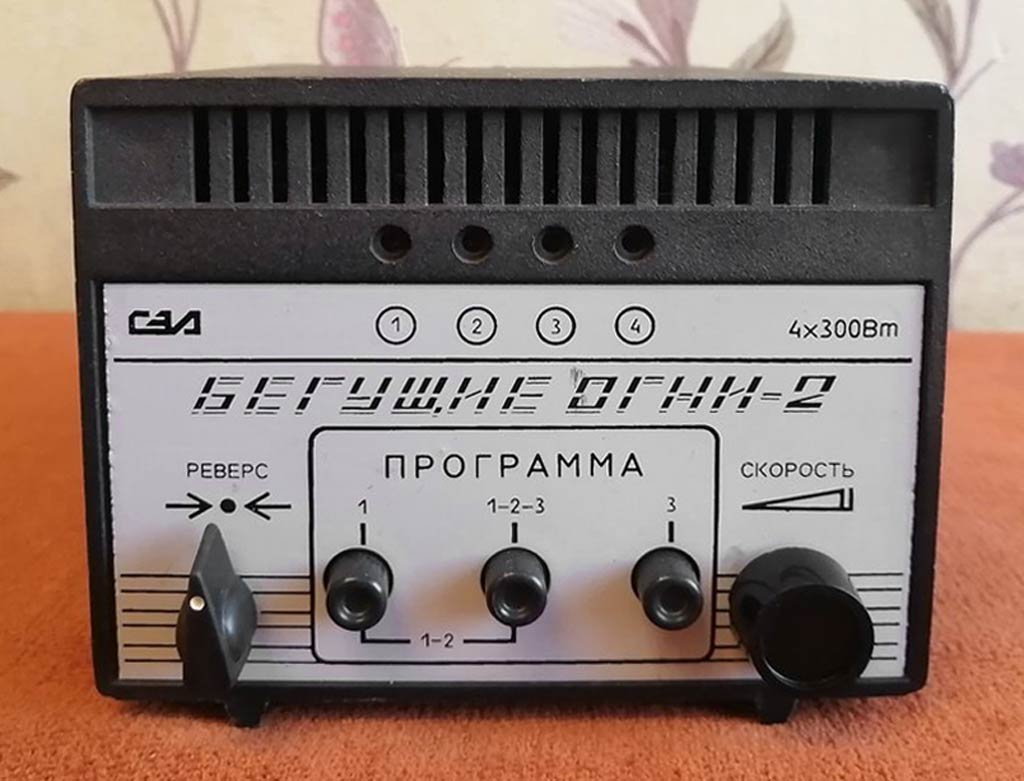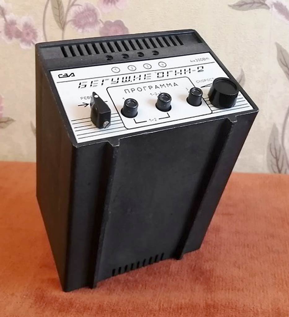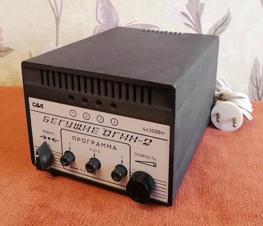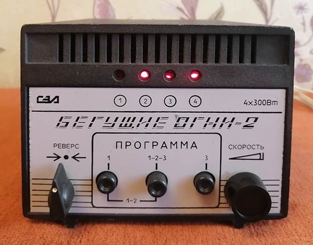 Устройство "Бегущие огни-2" с 1990 года выпускала московская компания "СЭА Электроникс". Предназначено для организации новогодних праздников или музыкальных шоу.