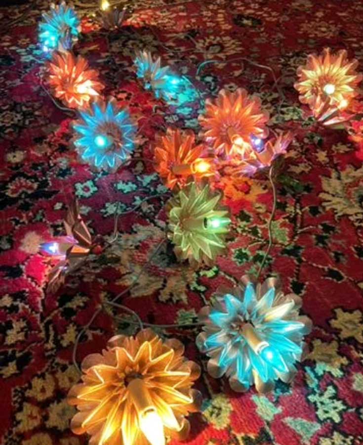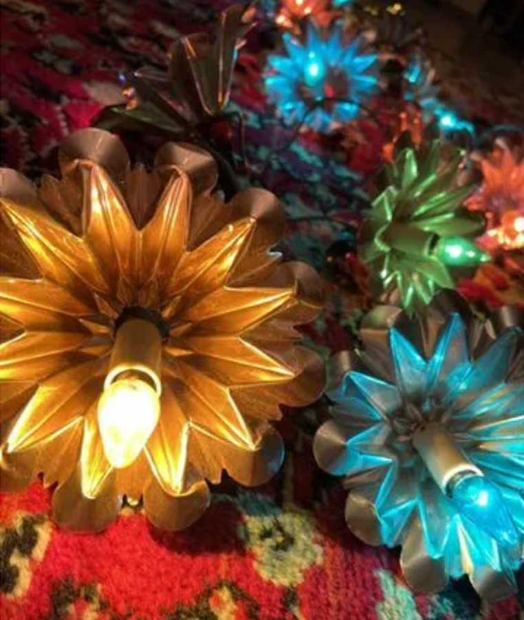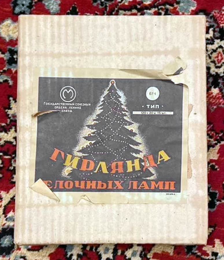 Гирлянда елочных ламп "ЕГ-1" выпускалась возможно с 1955 года Московским электроламповым заводом. Содержит 15 лампочек на прищепках и 15 фигурных отражателей из фольги.