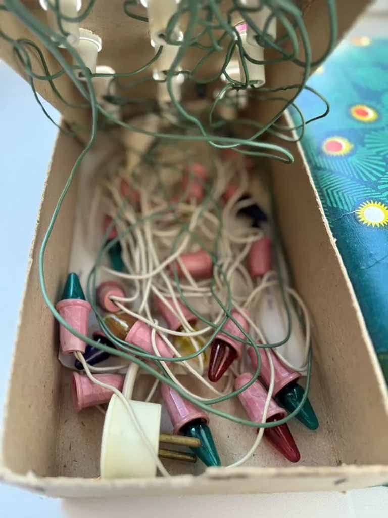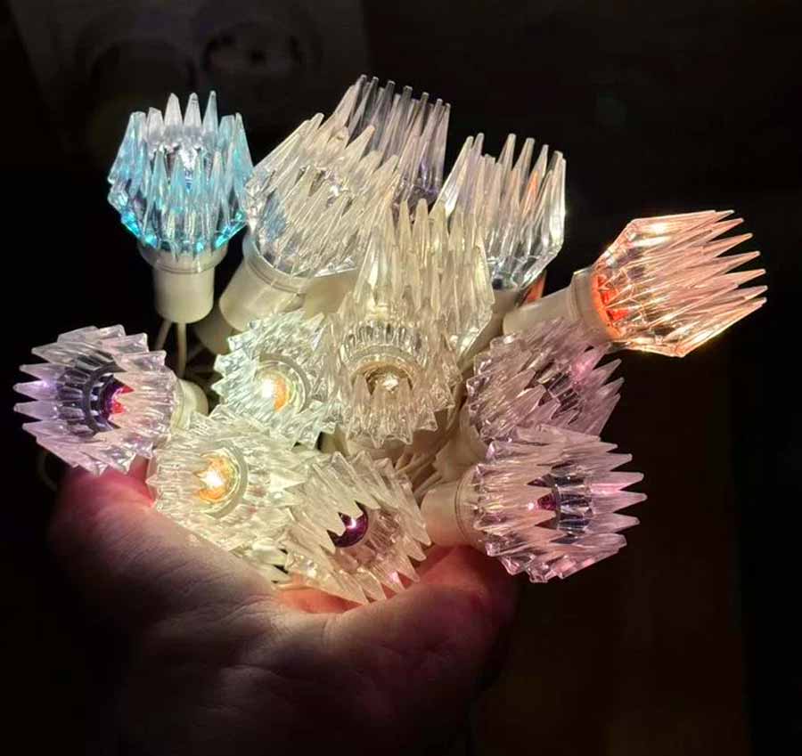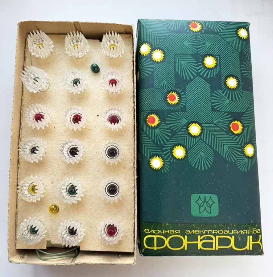 Ёлочная электрогирлянда "Фонарик" выпускалась с 1989 года Ленинградским ПО "Свет". Питание 220 вольт. 18 крашенных ламп.