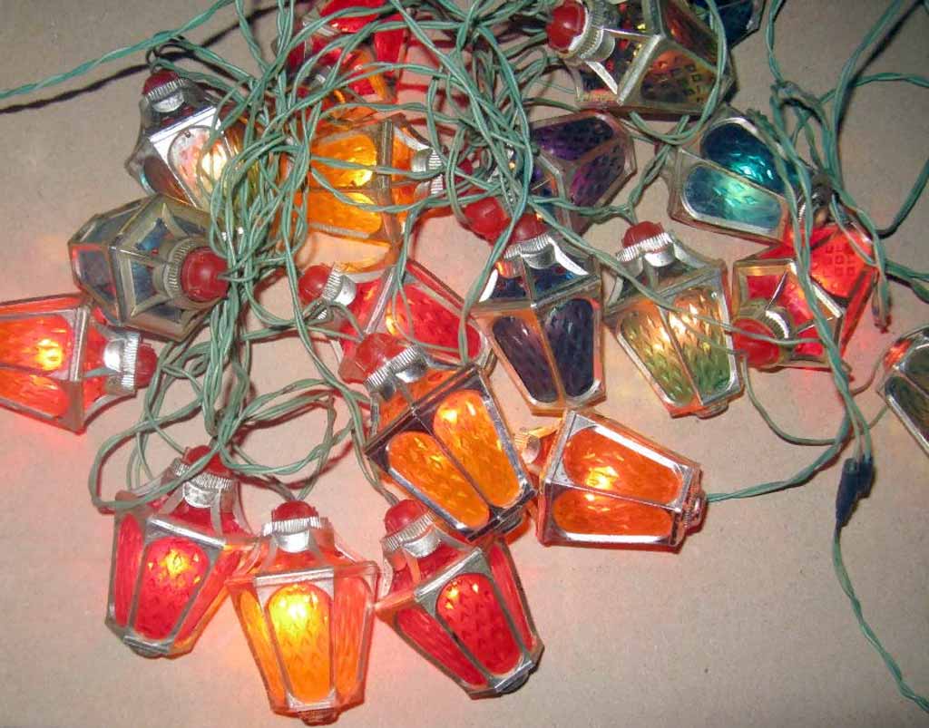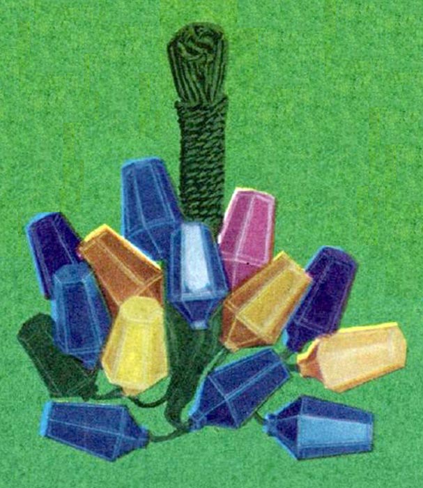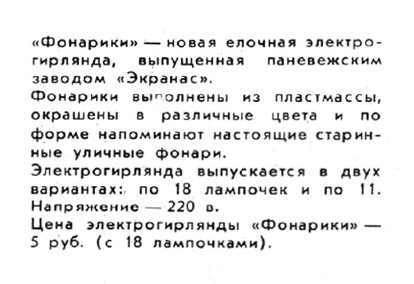 Ёлочная электрическая гирлянда "Фонарики" с 1971 года выпускал Паневежский завод "Экранас". Питание от сети 220 В. Лампочек 11 (26 В) или 18 (13,5 В). Цена гирлянды на 18 лампочек 5 рублей.
