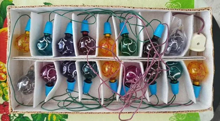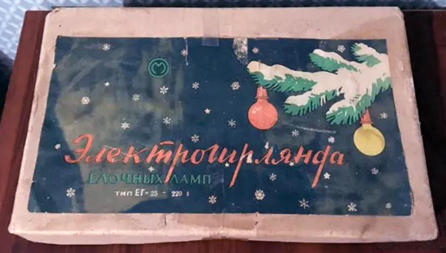 Электрогирлянда ёлочных ламп "ЕГ-25" выпускалась предположительно с 1965 года Московским электроламповым заводом. Рабочее напряжение 220 В. 15 ламп. 2 запасных.