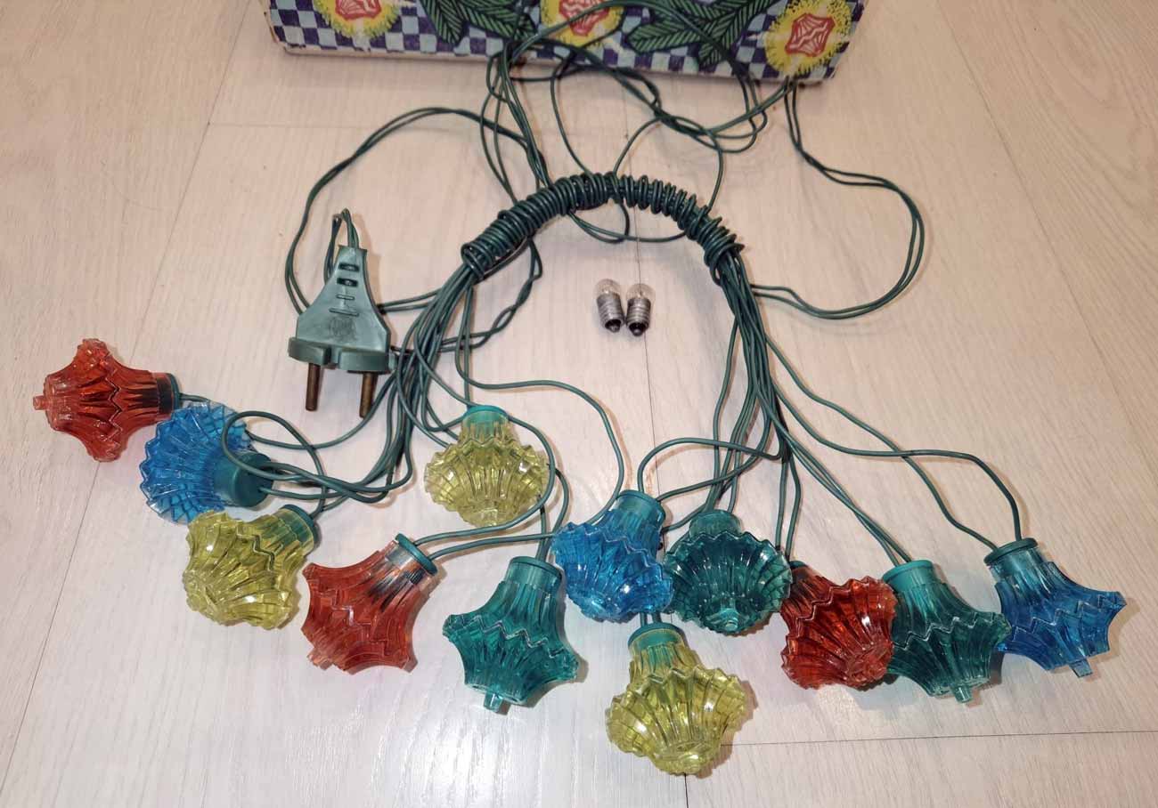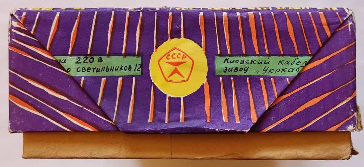 Гирлянда электрическая ёлочная "Искорка-1" производилась предположительно с 1982 года Киевским заводом "Укркабель". Питание - сеть 220 В. Ламп 12 + 2 запасных. Лампы - Е-26,5. Цветов - 4. Цена 4 рубля.