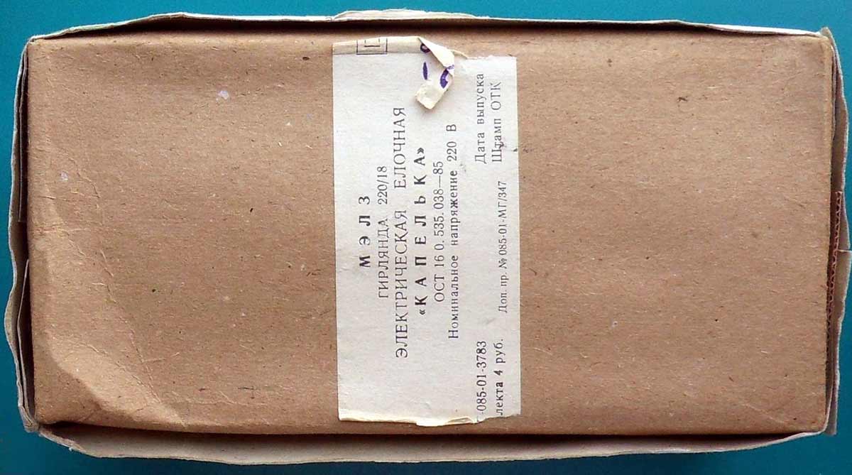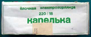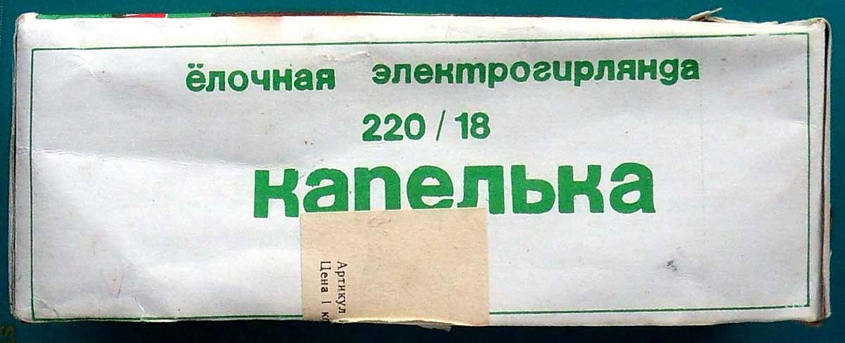 Ёлочная электрогирлянда "Капелька" возможно с 1986 года выпускалась Московским электроламповым заводом. Сеть 220 В. 18 ламп. Общая мощность 30 Вт.