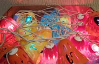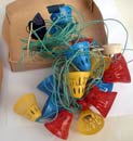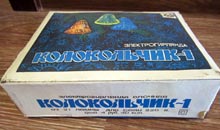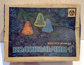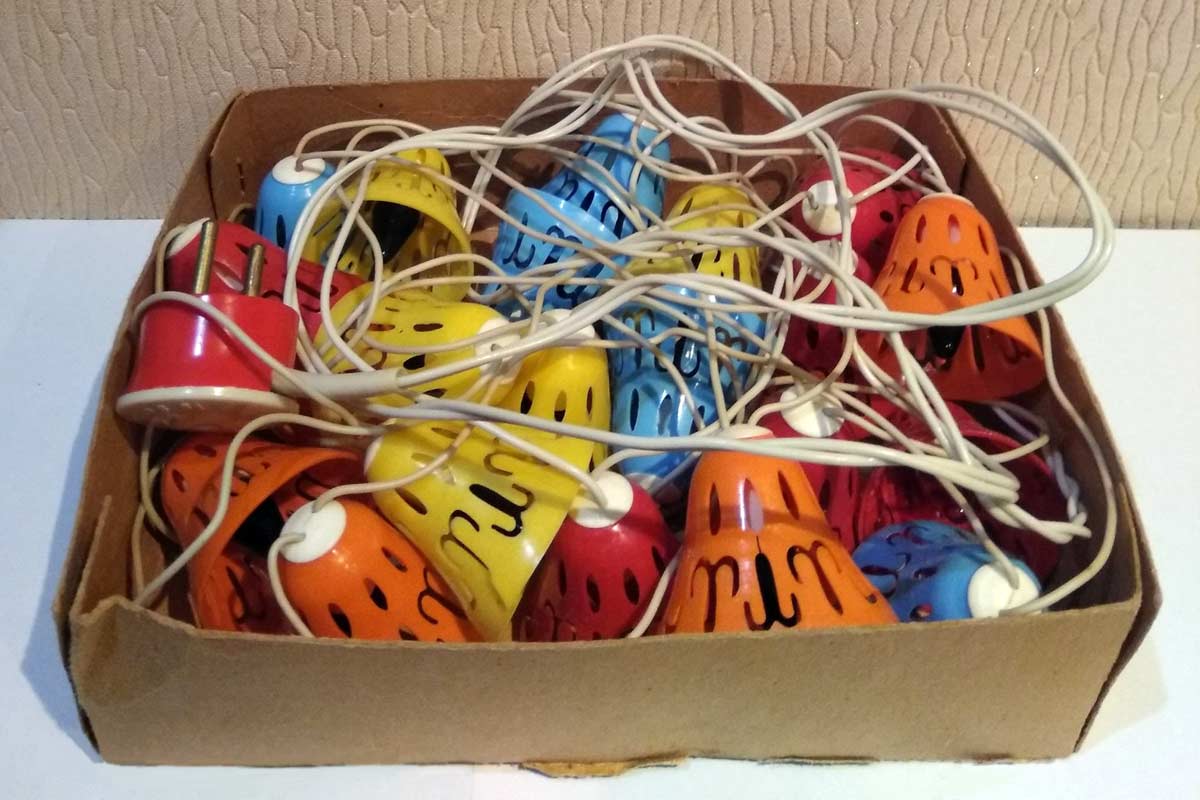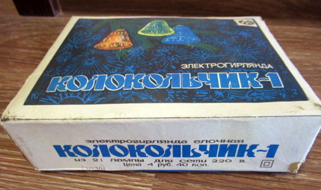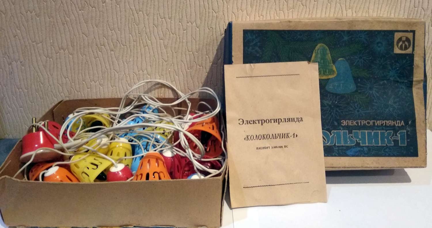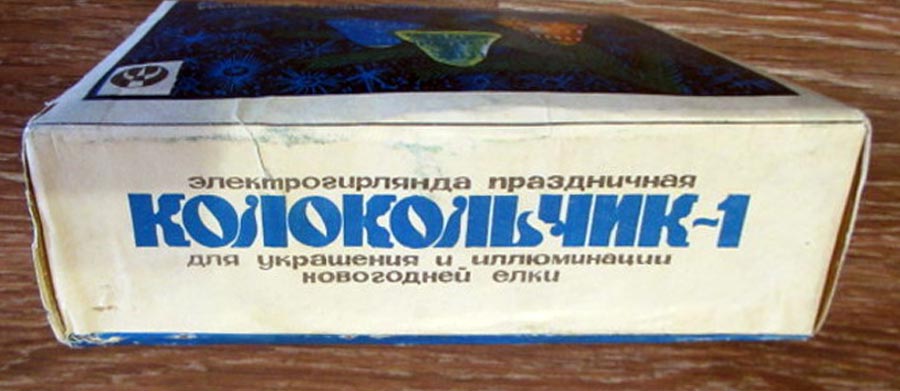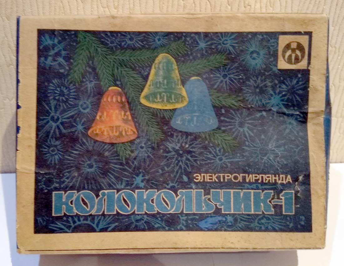 Ёлочная гирлянда "Колокольчик-1" выпускалась возможно с 1986 года неизвестным предприятием. Лампы 13,5 В х 0,12 А. 20 штук. Сеть - 220 В.