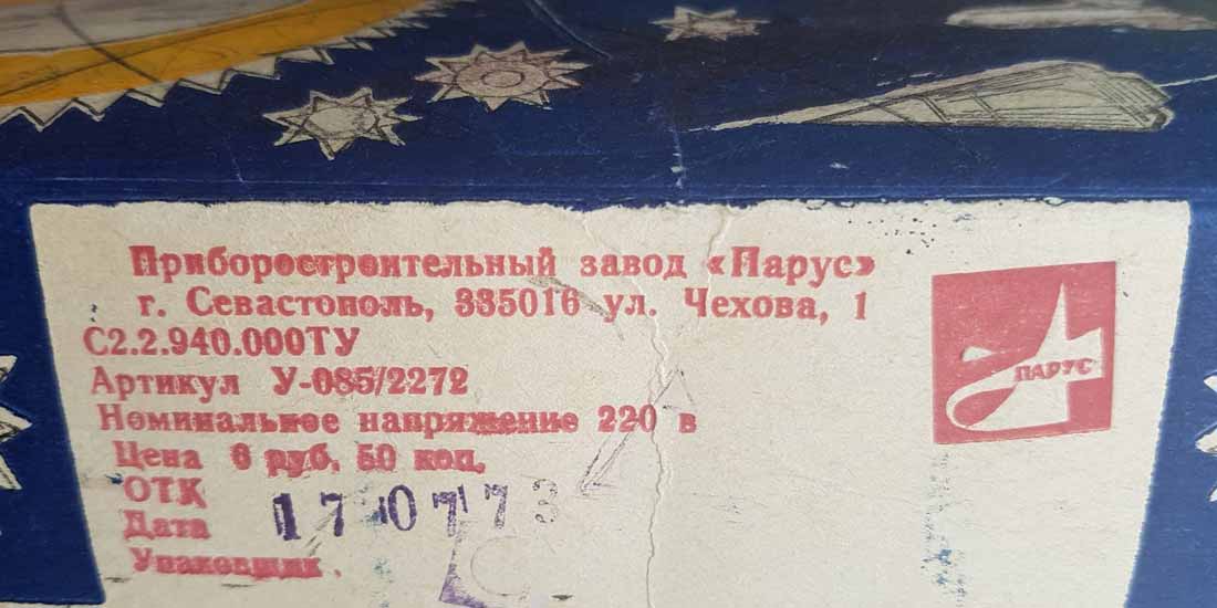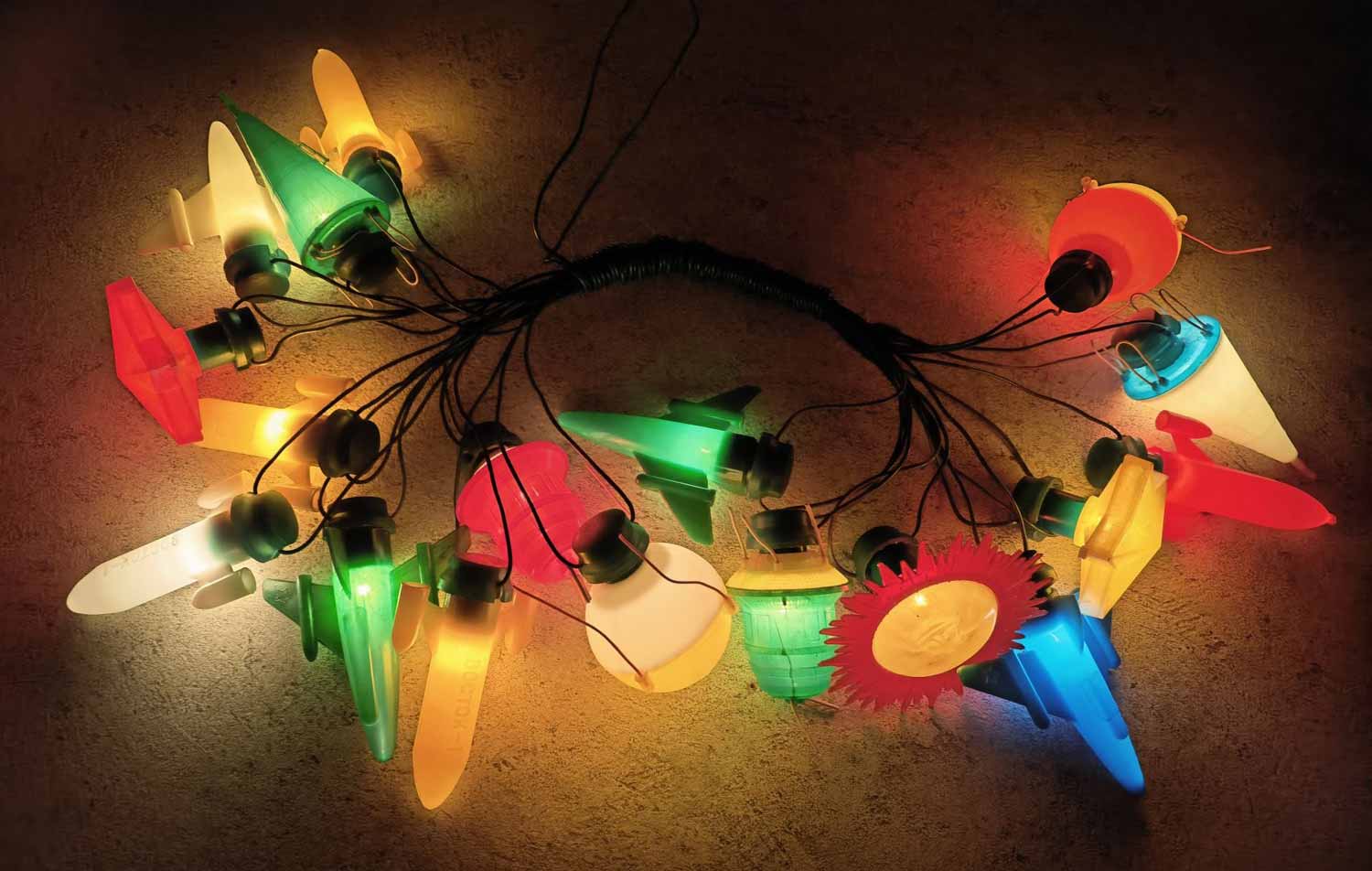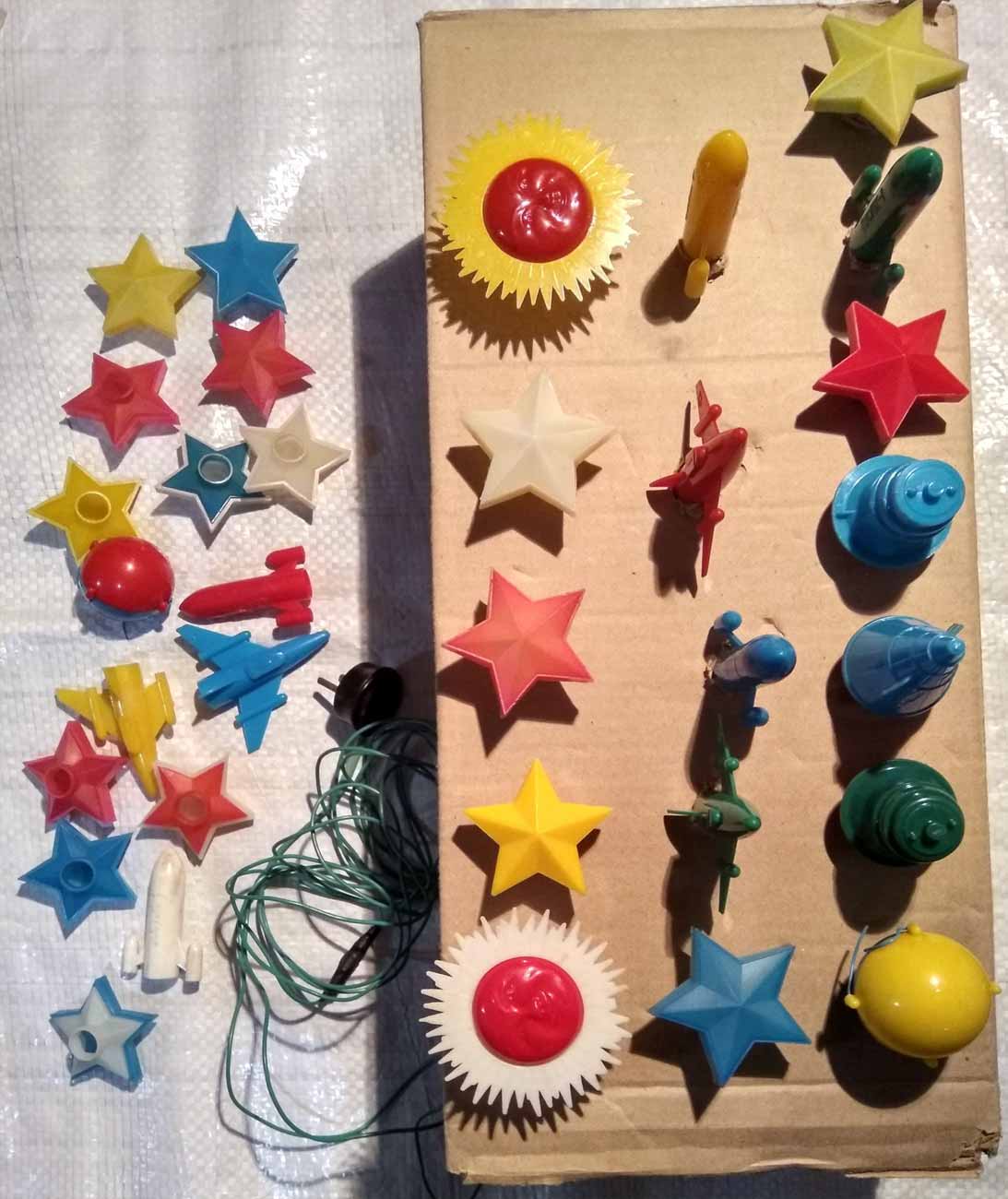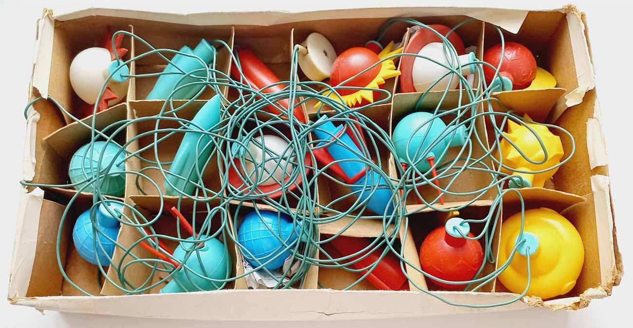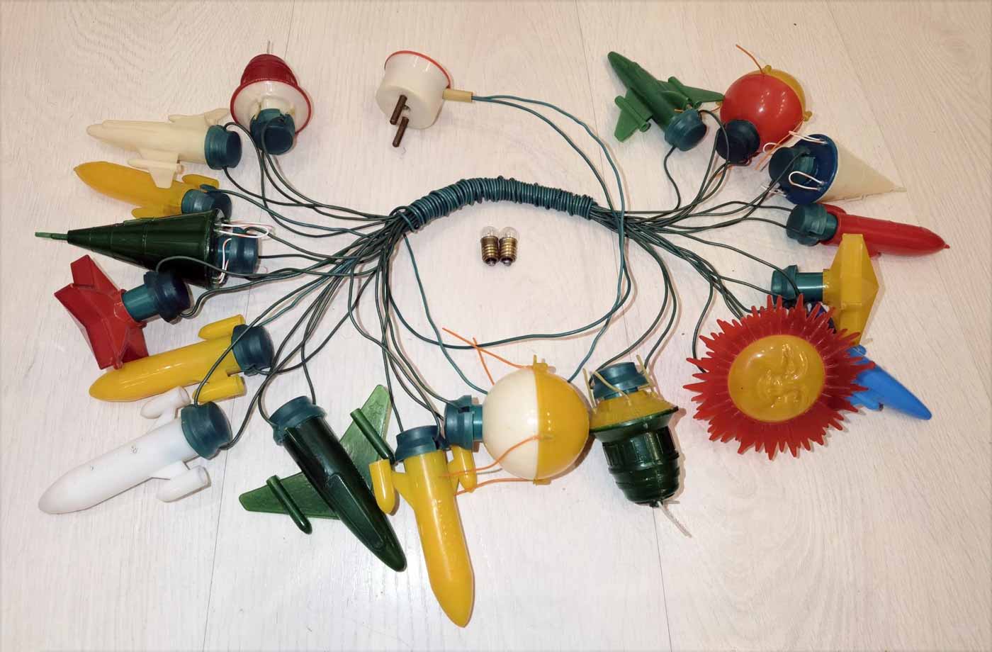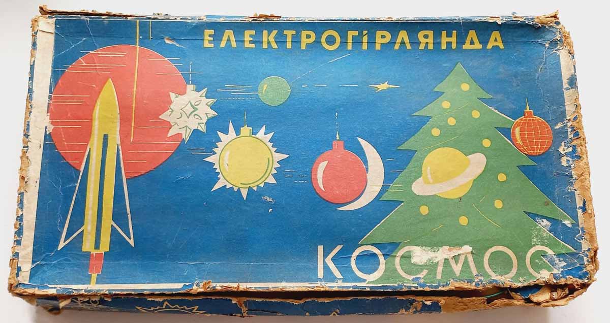 Электрическая ёлочная гирлянда "Космос" производилась несколькими предприятиями страны возможно с 1973 года и далее. Гирлянды разных предприятий в основном схожие. Ламп 18 или 20. Тип Е-13,5 х 0,16.