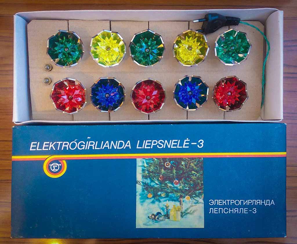 Электрогирлянда "Лепсняле-3" возможно с 1989 года выпускал Пабрадский завод "Модулис", Литва. Служит для иллюминации новогодних ёлок. Сеть 220 В. 10 ламп типа МН-26. Потребляемая мощность 30 Вт.