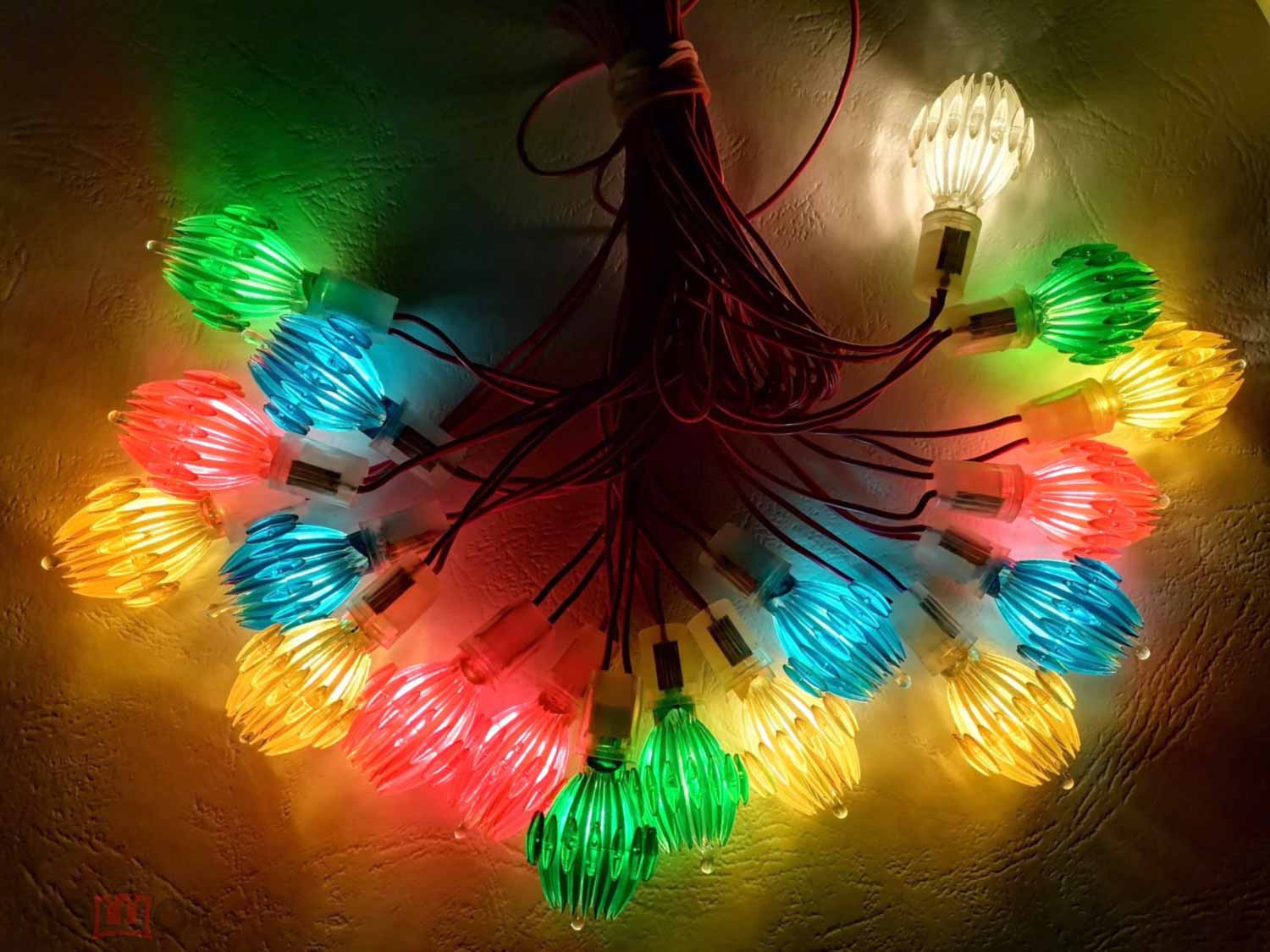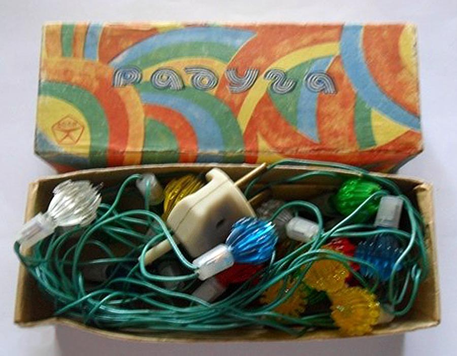Гирлянда электрическая "Радуга" производилась возможно с 1980 года Воронежским заводом электровакуумных приборов. Питание 220 В. Потребляемая мощность 20 Вт. Ламп 18 + 3 запасных, одна мигающая.