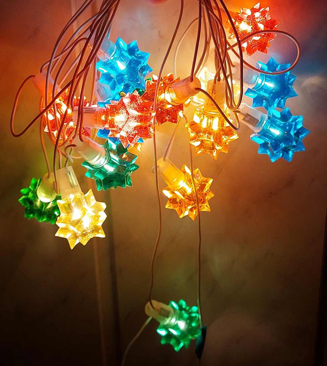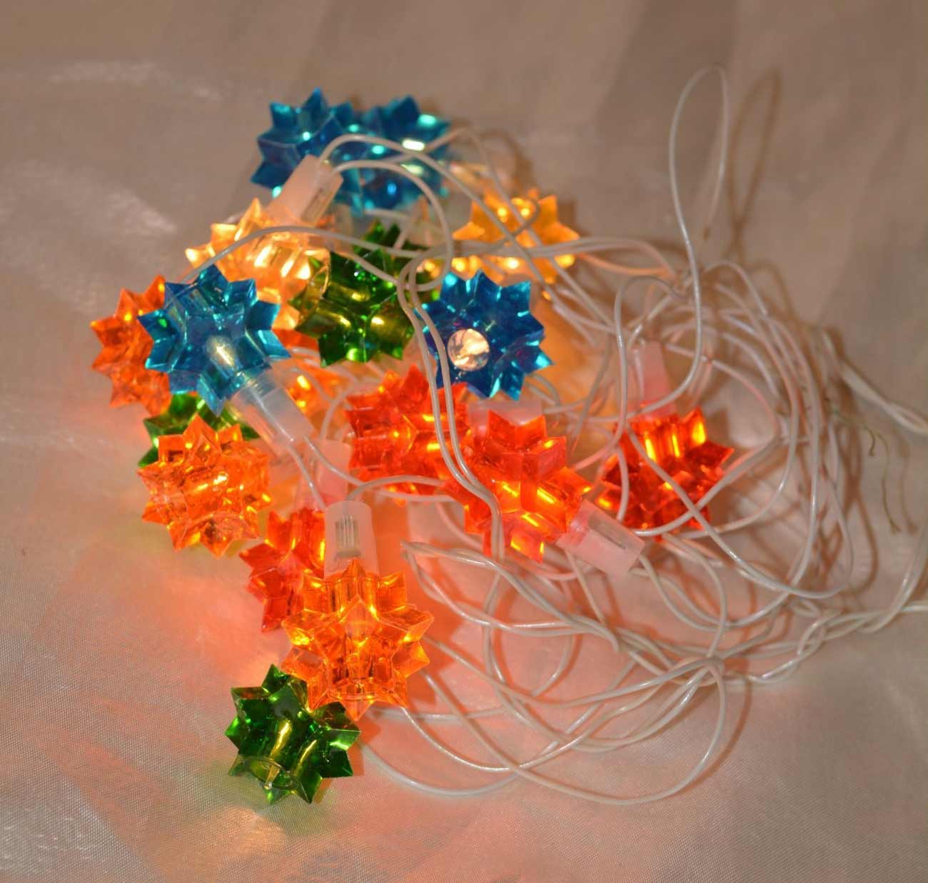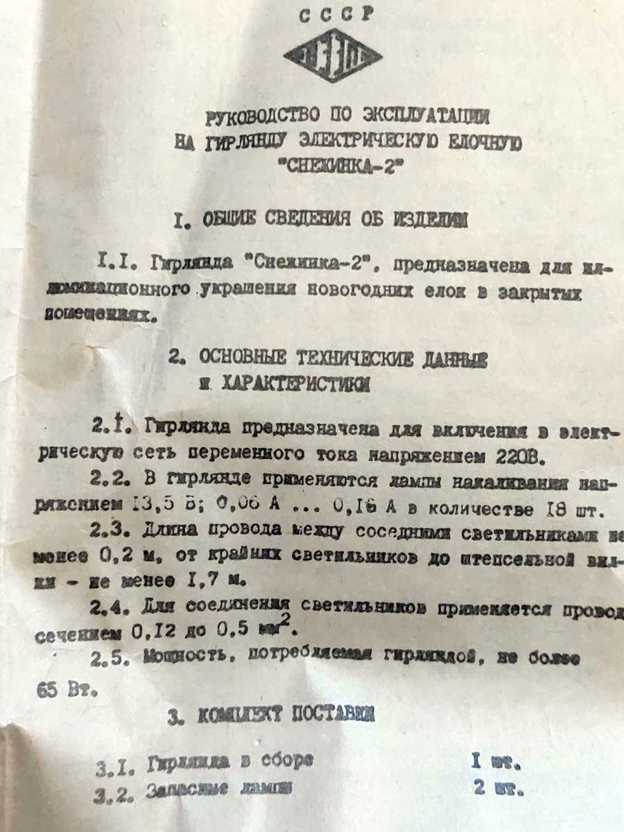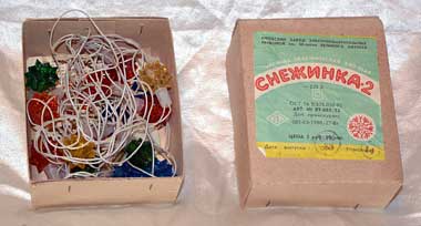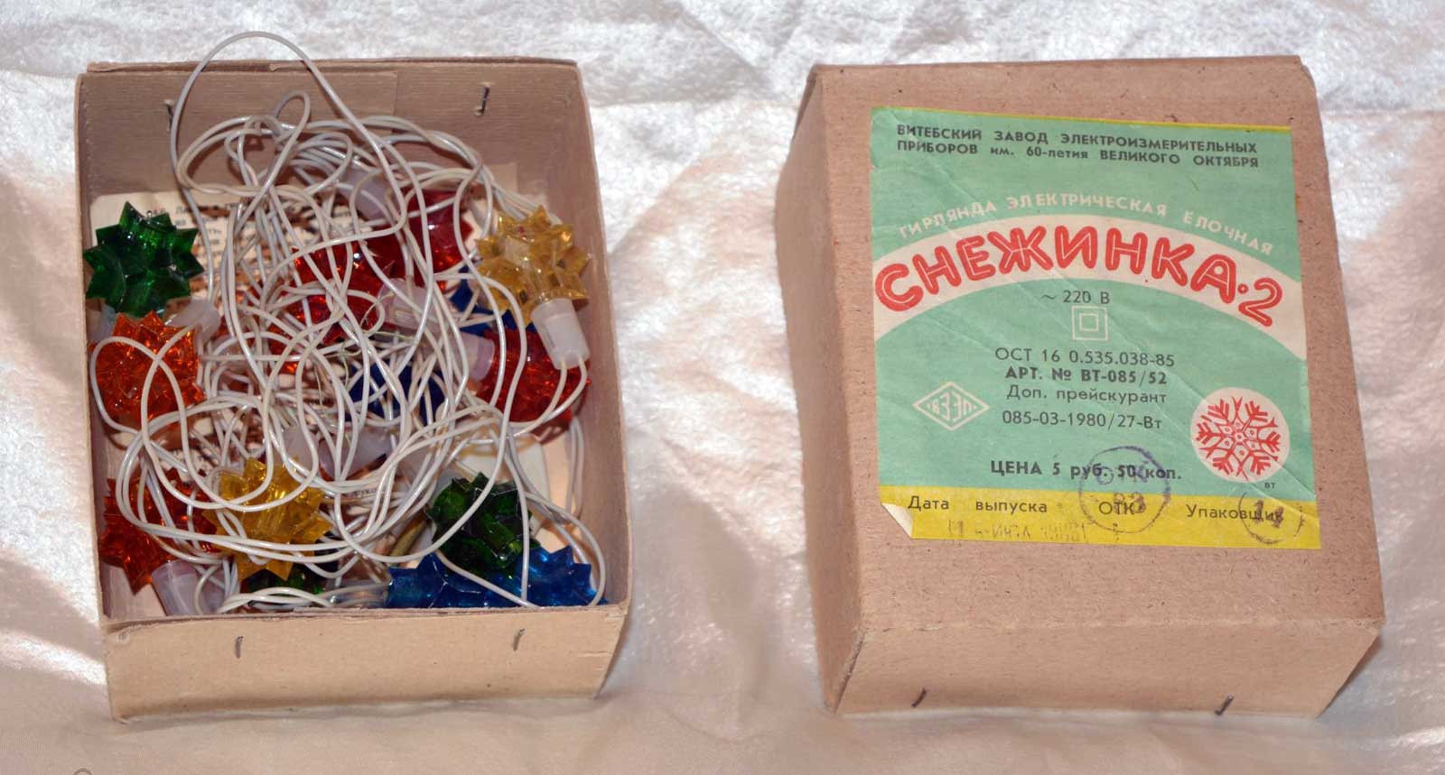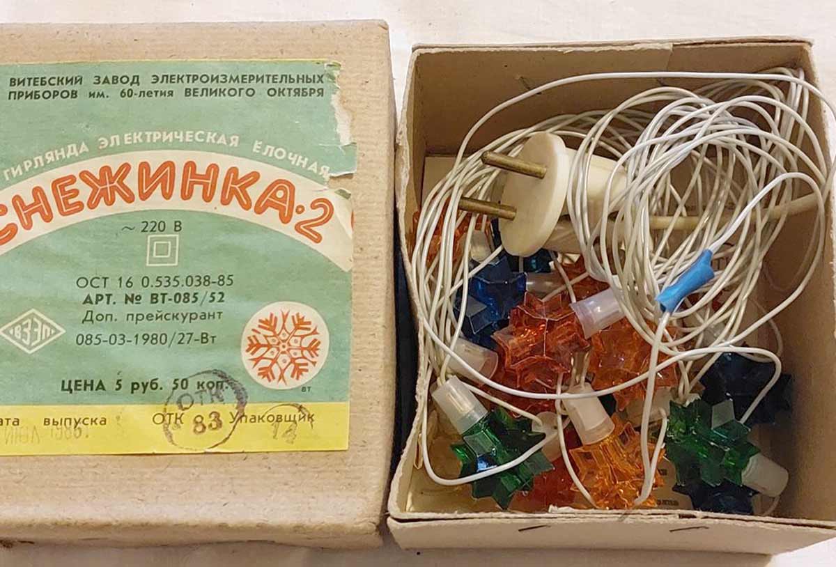 Гирлянда электрическая ёлочная "Снежинка-2" выпускалась с 1986 года Витебским заводом электроизмерительных приборов. Ламп 18х13,5 вольт.